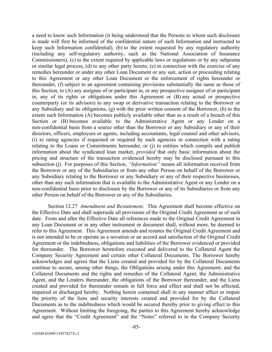-85- 116549.01049/134574273v.2 a need to know such Information (it being understood that the Persons to whom such disclosure is made will first be informed of the confidential nature of such Information and instructed to keep such Information confidential), (b) to the extent requested by any regulatory authority (including any self-regulatory authority, such as the National Association of Insurance Commissioners), (c) to the extent required by applicable laws or regulations or by any subpoena or similar legal process, (d) to any other party hereto, (e) in connection with the exercise of any remedies hereunder or under any other Loan Document or any suit, action or proceeding relating to this Agreement or any other Loan Document or the enforcement of rights hereunder or thereunder, (f) subject to an agreement containing provisions substantially the same as those of this Section, to (A) any assignee of or participant in, or any prospective assignee of or participant in, any of its rights or obligations under this Agreement or (B) any actual or prospective counterparty (or its advisors) to any swap or derivative transaction relating to the Borrower or any Subsidiary and its obligations, (g) with the prior written consent of the Borrower, (h) to the extent such Information (A) becomes publicly available other than as a result of a breach of this Section or (B) becomes available to the Administrative Agent or any Lender on a non-confidential basis from a source other than the Borrower or any Subsidiary or any of their directors, officers, employees or agents, including accountants, legal counsel and other advisors, (i) to rating agencies if requested or required by such agencies in connection with a rating relating to the Loans or Commitments hereunder, or (j) to entities which compile and publish information about the syndicated loan market, provided that only basic information about the pricing and structure of the transaction evidenced hereby may be disclosed pursuant to this subsection (j). For purposes of this Section, “Information” means all information received from the Borrower or any of the Subsidiaries or from any other Person on behalf of the Borrower or any Subsidiary relating to the Borrower or any Subsidiary or any of their respective businesses, other than any such information that is available to the Administrative Agent or any Lender on a non-confidential basis prior to disclosure by the Borrower or any of its Subsidiaries or from any other Person on behalf of the Borrower or any of the Subsidiaries. Section 12.27 Amendment and Restatement. This Agreement shall become effective on the Effective Date and shall supersede all provisions of the Original Credit Agreement as of such date. From and after the Effective Date all references made to the Original Credit Agreement in any Loan Document or in any other instrument or document shall, without more, be deemed to refer to this Agreement. This Agreement amends and restates the Original Credit Agreement and is not intended to be or operate as a novation or an accord and satisfaction of the Original Credit Agreement or the indebtedness, obligations and liabilities of the Borrower evidenced or provided for thereunder. The Borrower heretofore executed and delivered to the Collateral Agent the Company Security Agreement and certain other Collateral Documents. The Borrower hereby acknowledges and agrees that the Liens created and provided for by the Collateral Documents continue to secure, among other things, the Obligations arising under this Agreement; and the Collateral Documents and the rights and remedies of the Collateral Agent, the Administrative Agent, and the Lenders thereunder, the obligations of the Borrower thereunder, and the Liens created and provided for thereunder remain in full force and effect and shall not be affected, impaired or discharged hereby. Nothing herein contained shall in any manner affect or impair the priority of the liens and security interests created and provided for by the Collateral Documents as to the indebtedness which would be secured thereby prior to giving effect to this Agreement. Without limiting the foregoing, the parties to this Agreement hereby acknowledge and agree that the “Credit Agreement” and the “Notes” referred to in the Company Security