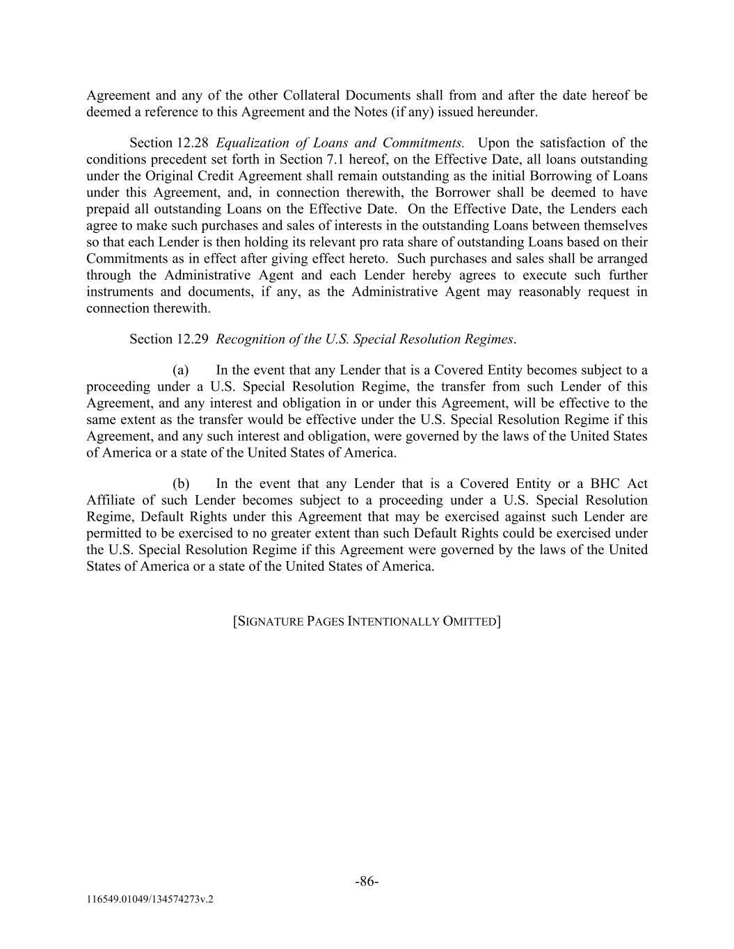 -86- 116549.01049/134574273v.2 Agreement and any of the other Collateral Documents shall from and after the date hereof be deemed a reference to this Agreement and the Notes (if any) issued hereunder. Section 12.28 Equalization of Loans and Commitments. Upon the satisfaction of the conditions precedent set forth in Section 7.1 hereof, on the Effective Date, all loans outstanding under the Original Credit Agreement shall remain outstanding as the initial Borrowing of Loans under this Agreement, and, in connection therewith, the Borrower shall be deemed to have prepaid all outstanding Loans on the Effective Date. On the Effective Date, the Lenders each agree to make such purchases and sales of interests in the outstanding Loans between themselves so that each Lender is then holding its relevant pro rata share of outstanding Loans based on their Commitments as in effect after giving effect hereto. Such purchases and sales shall be arranged through the Administrative Agent and each Lender hereby agrees to execute such further instruments and documents, if any, as the Administrative Agent may reasonably request in connection therewith. Section 12.29 Recognition of the U.S. Special Resolution Regimes. (a) In the event that any Lender that is a Covered Entity becomes subject to a proceeding under a U.S. Special Resolution Regime, the transfer from such Lender of this Agreement, and any interest and obligation in or under this Agreement, will be effective to the same extent as the transfer would be effective under the U.S. Special Resolution Regime if this Agreement, and any such interest and obligation, were governed by the laws of the United States of America or a state of the United States of America. (b) In the event that any Lender that is a Covered Entity or a BHC Act Affiliate of such Lender becomes subject to a proceeding under a U.S. Special Resolution Regime, Default Rights under this Agreement that may be exercised against such Lender are permitted to be exercised to no greater extent than such Default Rights could be exercised under the U.S. Special Resolution Regime if this Agreement were governed by the laws of the United States of America or a state of the United States of America. [SIGNATURE PAGES INTENTIONALLY OMITTED]