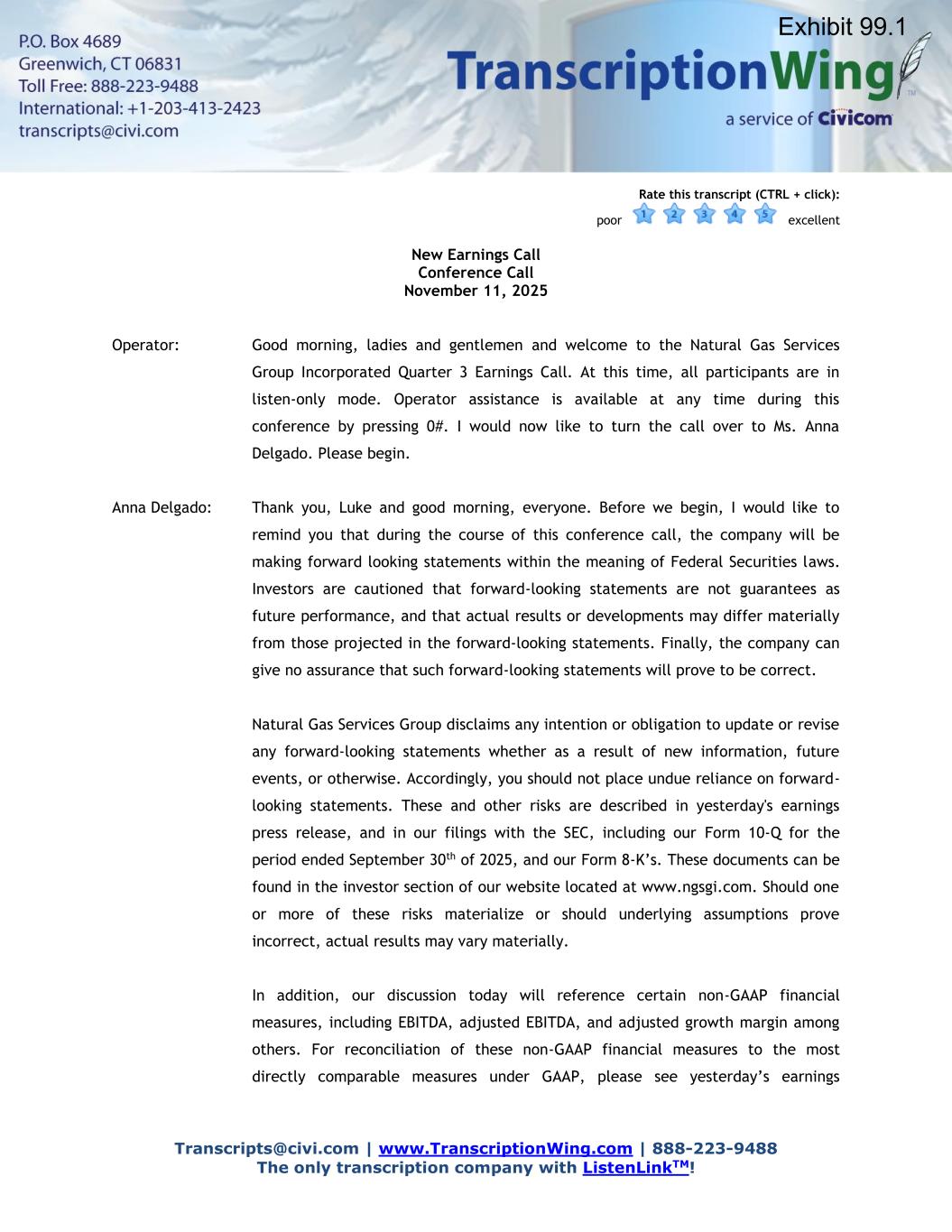 Transcripts@civi.com | www.TranscriptionWing.com | 888-223-9488 The only transcription company with ListenLinkTM! Rate this transcript (CTRL + click): poor excellent New Earnings Call Conference Call November 11, 2025 Operator: Good morning, ladies and gentlemen and welcome to the Natural Gas Services Group Incorporated Quarter 3 Earnings Call. At this time, all participants are in listen-only mode. Operator assistance is available at any time during this conference by pressing 0#. I would now like to turn the call over to Ms. Anna Delgado. Please begin. Anna Delgado: Thank you, Luke and good morning, everyone. Before we begin, I would like to remind you that during the course of this conference call, the company will be making forward looking statements within the meaning of Federal Securities laws. Investors are cautioned that forward-looking statements are not guarantees as future performance, and that actual results or developments may differ materially from those projected in the forward-looking statements. Finally, the company can give no assurance that such forward-looking statements will prove to be correct. Natural Gas Services Group disclaims any intention or obligation to update or revise any forward-looking statements whether as a result of new information, future events, or otherwise. Accordingly, you should not place undue reliance on forward- looking statements. These and other risks are described in yesterday's earnings press release, and in our filings with the SEC, including our Form 10-Q for the period ended September 30th of 2025, and our Form 8-K’s. These documents can be found in the investor section of our website located at www.ngsgi.com. Should one or more of these risks materialize or should underlying assumptions prove incorrect, actual results may vary materially. In addition, our discussion today will reference certain non-GAAP financial measures, including EBITDA, adjusted EBITDA, and adjusted growth margin among others. For reconciliation of these non-GAAP financial measures to the most directly comparable measures under GAAP, please see yesterday’s earnings Exhibit 99.1