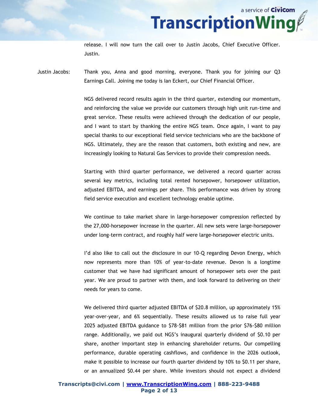 Transcripts@civi.com | www.TranscriptionWing.com | 888-223-9488 Page 2 of 13 release. I will now turn the call over to Justin Jacobs, Chief Executive Officer. Justin. Justin Jacobs: Thank you, Anna and good morning, everyone. Thank you for joining our Q3 Earnings Call. Joining me today is Ian Eckert, our Chief Financial Officer. NGS delivered record results again in the third quarter, extending our momentum, and reinforcing the value we provide our customers through high unit run-time and great service. These results were achieved through the dedication of our people, and I want to start by thanking the entire NGS team. Once again, I want to pay special thanks to our exceptional field service technicians who are the backbone of NGS. Ultimately, they are the reason that customers, both existing and new, are increasingly looking to Natural Gas Services to provide their compression needs. Starting with third quarter performance, we delivered a record quarter across several key metrics, including total rented horsepower, horsepower utilization, adjusted EBITDA, and earnings per share. This performance was driven by strong field service execution and excellent technology enable uptime. We continue to take market share in large-horsepower compression reflected by the 27,000-horsepower increase in the quarter. All new sets were large-horsepower under long-term contract, and roughly half were large-horsepower electric units. I’d also like to call out the disclosure in our 10-Q regarding Devon Energy, which now represents more than 10% of year-to-date revenue. Devon is a longtime customer that we have had significant amount of horsepower sets over the past year. We are proud to partner with them, and look forward to delivering on their needs for years to come. We delivered third quarter adjusted EBITDA of $20.8 million, up approximately 15% year-over-year, and 6% sequentially. These results allowed us to raise full year 2025 adjusted EBITDA guidance to $78-$81 million from the prior $76-$80 million range. Additionally, we paid out NGS’s inaugural quarterly dividend of $0.10 per share, another important step in enhancing shareholder returns. Our compelling performance, durable operating cashflows, and confidence in the 2026 outlook, make it possible to increase our fourth quarter dividend by 10% to $0.11 per share, or an annualized $0.44 per share. While investors should not expect a dividend