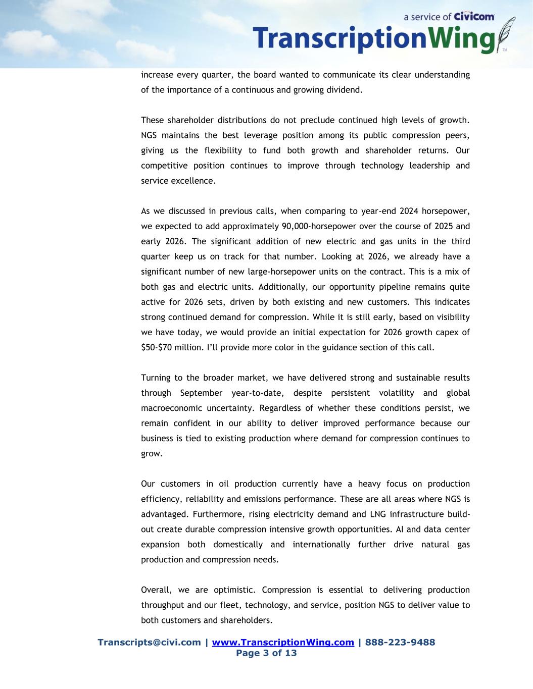 Transcripts@civi.com | www.TranscriptionWing.com | 888-223-9488 Page 3 of 13 increase every quarter, the board wanted to communicate its clear understanding of the importance of a continuous and growing dividend. These shareholder distributions do not preclude continued high levels of growth. NGS maintains the best leverage position among its public compression peers, giving us the flexibility to fund both growth and shareholder returns. Our competitive position continues to improve through technology leadership and service excellence. As we discussed in previous calls, when comparing to year-end 2024 horsepower, we expected to add approximately 90,000-horsepower over the course of 2025 and early 2026. The significant addition of new electric and gas units in the third quarter keep us on track for that number. Looking at 2026, we already have a significant number of new large-horsepower units on the contract. This is a mix of both gas and electric units. Additionally, our opportunity pipeline remains quite active for 2026 sets, driven by both existing and new customers. This indicates strong continued demand for compression. While it is still early, based on visibility we have today, we would provide an initial expectation for 2026 growth capex of $50-$70 million. I’ll provide more color in the guidance section of this call. Turning to the broader market, we have delivered strong and sustainable results through September year-to-date, despite persistent volatility and global macroeconomic uncertainty. Regardless of whether these conditions persist, we remain confident in our ability to deliver improved performance because our business is tied to existing production where demand for compression continues to grow. Our customers in oil production currently have a heavy focus on production efficiency, reliability and emissions performance. These are all areas where NGS is advantaged. Furthermore, rising electricity demand and LNG infrastructure build- out create durable compression intensive growth opportunities. AI and data center expansion both domestically and internationally further drive natural gas production and compression needs. Overall, we are optimistic. Compression is essential to delivering production throughput and our fleet, technology, and service, position NGS to deliver value to both customers and shareholders.