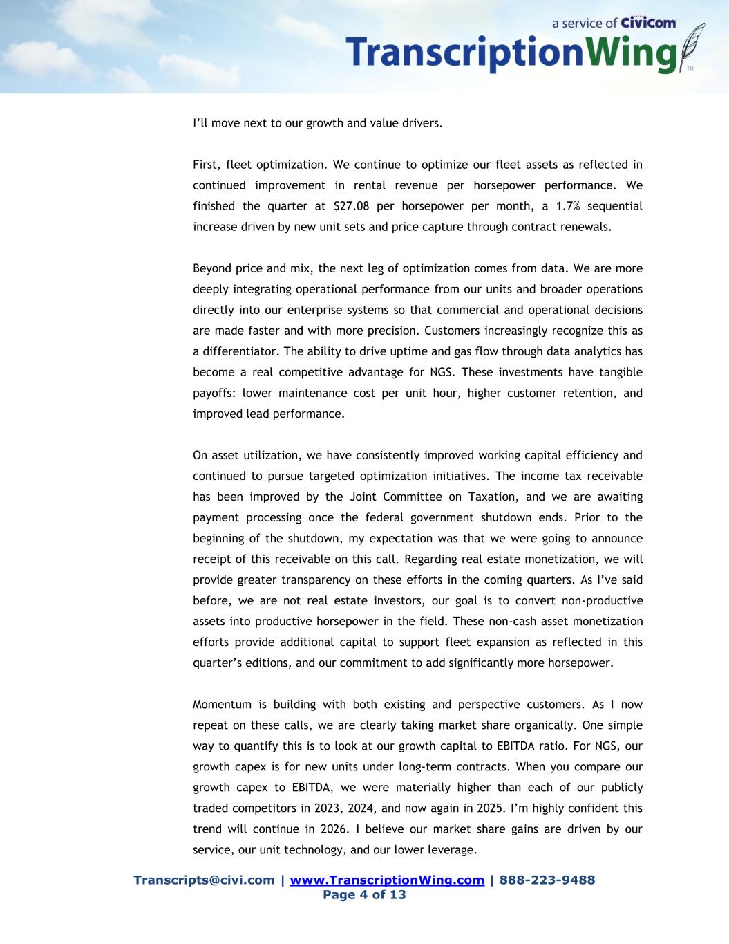 Transcripts@civi.com | www.TranscriptionWing.com | 888-223-9488 Page 4 of 13 I’ll move next to our growth and value drivers. First, fleet optimization. We continue to optimize our fleet assets as reflected in continued improvement in rental revenue per horsepower performance. We finished the quarter at $27.08 per horsepower per month, a 1.7% sequential increase driven by new unit sets and price capture through contract renewals. Beyond price and mix, the next leg of optimization comes from data. We are more deeply integrating operational performance from our units and broader operations directly into our enterprise systems so that commercial and operational decisions are made faster and with more precision. Customers increasingly recognize this as a differentiator. The ability to drive uptime and gas flow through data analytics has become a real competitive advantage for NGS. These investments have tangible payoffs: lower maintenance cost per unit hour, higher customer retention, and improved lead performance. On asset utilization, we have consistently improved working capital efficiency and continued to pursue targeted optimization initiatives. The income tax receivable has been improved by the Joint Committee on Taxation, and we are awaiting payment processing once the federal government shutdown ends. Prior to the beginning of the shutdown, my expectation was that we were going to announce receipt of this receivable on this call. Regarding real estate monetization, we will provide greater transparency on these efforts in the coming quarters. As I’ve said before, we are not real estate investors, our goal is to convert non-productive assets into productive horsepower in the field. These non-cash asset monetization efforts provide additional capital to support fleet expansion as reflected in this quarter’s editions, and our commitment to add significantly more horsepower. Momentum is building with both existing and perspective customers. As I now repeat on these calls, we are clearly taking market share organically. One simple way to quantify this is to look at our growth capital to EBITDA ratio. For NGS, our growth capex is for new units under long-term contracts. When you compare our growth capex to EBITDA, we were materially higher than each of our publicly traded competitors in 2023, 2024, and now again in 2025. I’m highly confident this trend will continue in 2026. I believe our market share gains are driven by our service, our unit technology, and our lower leverage.