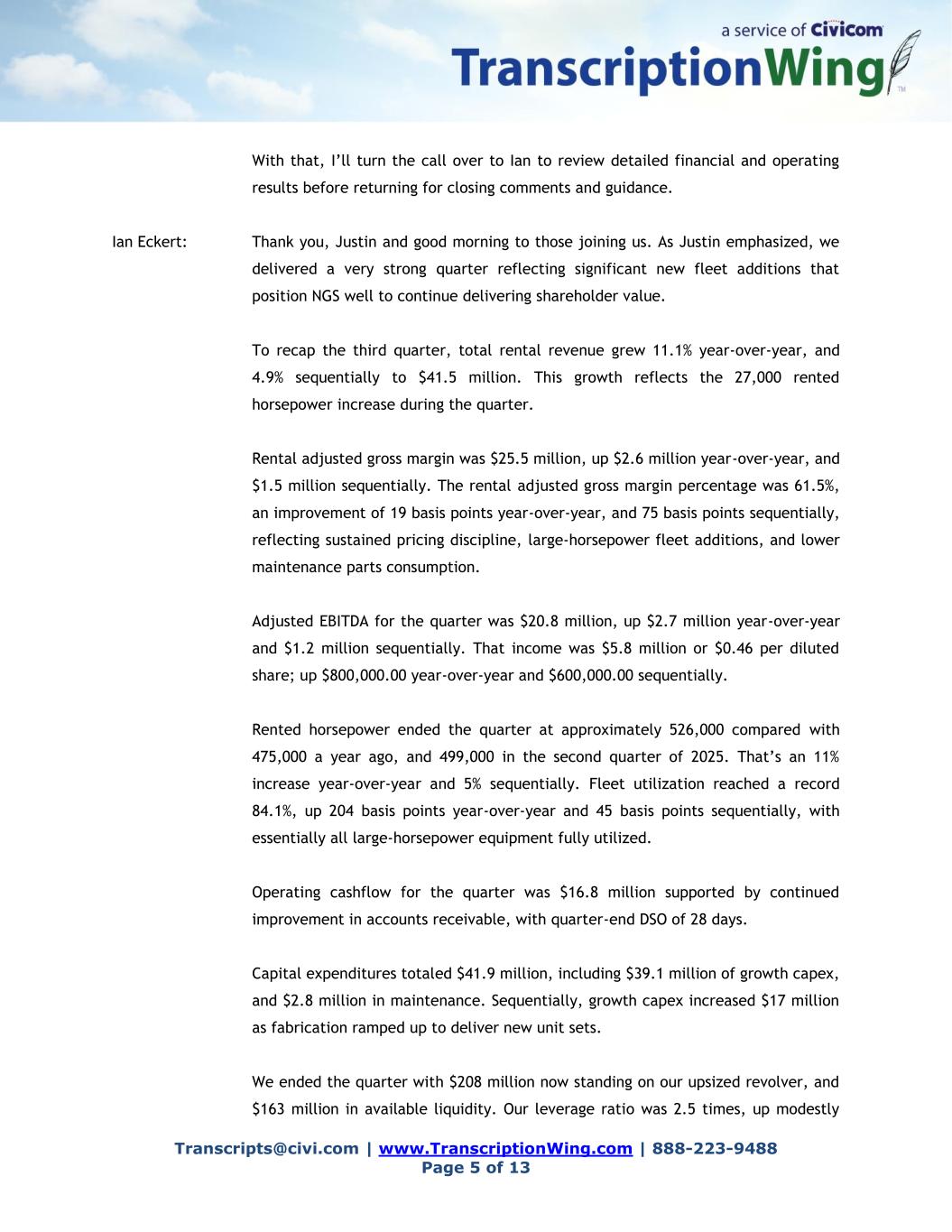 Transcripts@civi.com | www.TranscriptionWing.com | 888-223-9488 Page 5 of 13 With that, I’ll turn the call over to Ian to review detailed financial and operating results before returning for closing comments and guidance. Ian Eckert: Thank you, Justin and good morning to those joining us. As Justin emphasized, we delivered a very strong quarter reflecting significant new fleet additions that position NGS well to continue delivering shareholder value. To recap the third quarter, total rental revenue grew 11.1% year-over-year, and 4.9% sequentially to $41.5 million. This growth reflects the 27,000 rented horsepower increase during the quarter. Rental adjusted gross margin was $25.5 million, up $2.6 million year-over-year, and $1.5 million sequentially. The rental adjusted gross margin percentage was 61.5%, an improvement of 19 basis points year-over-year, and 75 basis points sequentially, reflecting sustained pricing discipline, large-horsepower fleet additions, and lower maintenance parts consumption. Adjusted EBITDA for the quarter was $20.8 million, up $2.7 million year-over-year and $1.2 million sequentially. That income was $5.8 million or $0.46 per diluted share; up $800,000.00 year-over-year and $600,000.00 sequentially. Rented horsepower ended the quarter at approximately 526,000 compared with 475,000 a year ago, and 499,000 in the second quarter of 2025. That’s an 11% increase year-over-year and 5% sequentially. Fleet utilization reached a record 84.1%, up 204 basis points year-over-year and 45 basis points sequentially, with essentially all large-horsepower equipment fully utilized. Operating cashflow for the quarter was $16.8 million supported by continued improvement in accounts receivable, with quarter-end DSO of 28 days. Capital expenditures totaled $41.9 million, including $39.1 million of growth capex, and $2.8 million in maintenance. Sequentially, growth capex increased $17 million as fabrication ramped up to deliver new unit sets. We ended the quarter with $208 million now standing on our upsized revolver, and $163 million in available liquidity. Our leverage ratio was 2.5 times, up modestly