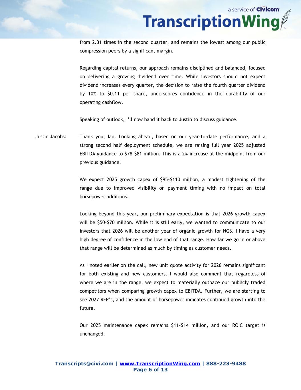 Transcripts@civi.com | www.TranscriptionWing.com | 888-223-9488 Page 6 of 13 from 2.31 times in the second quarter, and remains the lowest among our public compression peers by a significant margin. Regarding capital returns, our approach remains disciplined and balanced, focused on delivering a growing dividend over time. While investors should not expect dividend increases every quarter, the decision to raise the fourth quarter dividend by 10% to $0.11 per share, underscores confidence in the durability of our operating cashflow. Speaking of outlook, I’ll now hand it back to Justin to discuss guidance. Justin Jacobs: Thank you, Ian. Looking ahead, based on our year-to-date performance, and a strong second half deployment schedule, we are raising full year 2025 adjusted EBITDA guidance to $78-$81 million. This is a 2% increase at the midpoint from our previous guidance. We expect 2025 growth capex of $95-$110 million, a modest tightening of the range due to improved visibility on payment timing with no impact on total horsepower additions. Looking beyond this year, our preliminary expectation is that 2026 growth capex will be $50-$70 million. While it is still early, we wanted to communicate to our investors that 2026 will be another year of organic growth for NGS. I have a very high degree of confidence in the low end of that range. How far we go in or above that range will be determined as much by timing as customer needs. As I noted earlier on the call, new unit quote activity for 2026 remains significant for both existing and new customers. I would also comment that regardless of where we are in the range, we expect to materially outpace our publicly traded competitors when comparing growth capex to EBITDA. Further, we are starting to see 2027 RFP’s, and the amount of horsepower indicates continued growth into the future. Our 2025 maintenance capex remains $11-$14 million, and our ROIC target is unchanged.