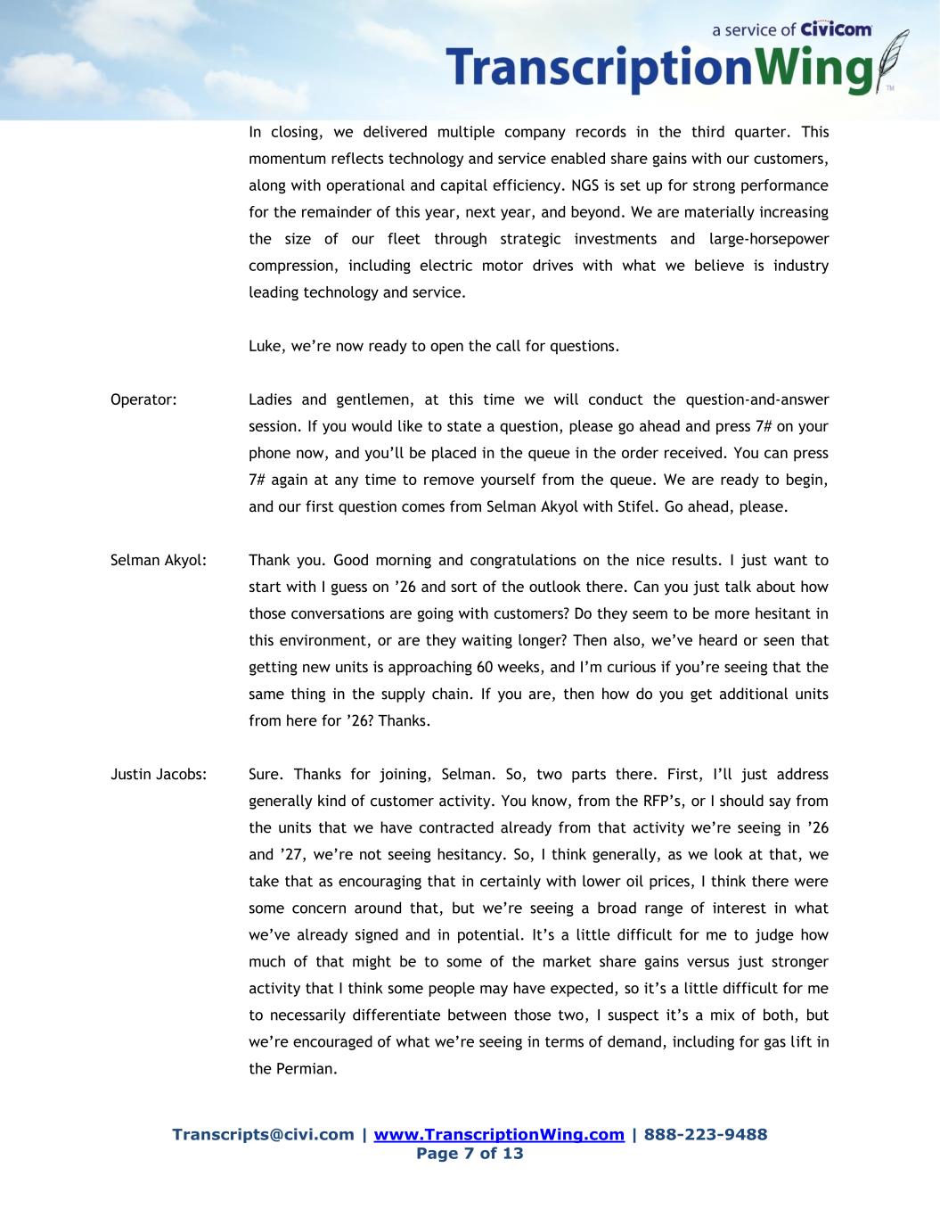 Transcripts@civi.com | www.TranscriptionWing.com | 888-223-9488 Page 7 of 13 In closing, we delivered multiple company records in the third quarter. This momentum reflects technology and service enabled share gains with our customers, along with operational and capital efficiency. NGS is set up for strong performance for the remainder of this year, next year, and beyond. We are materially increasing the size of our fleet through strategic investments and large-horsepower compression, including electric motor drives with what we believe is industry leading technology and service. Luke, we’re now ready to open the call for questions. Operator: Ladies and gentlemen, at this time we will conduct the question-and-answer session. If you would like to state a question, please go ahead and press 7# on your phone now, and you’ll be placed in the queue in the order received. You can press 7# again at any time to remove yourself from the queue. We are ready to begin, and our first question comes from Selman Akyol with Stifel. Go ahead, please. Selman Akyol: Thank you. Good morning and congratulations on the nice results. I just want to start with I guess on ’26 and sort of the outlook there. Can you just talk about how those conversations are going with customers? Do they seem to be more hesitant in this environment, or are they waiting longer? Then also, we’ve heard or seen that getting new units is approaching 60 weeks, and I’m curious if you’re seeing that the same thing in the supply chain. If you are, then how do you get additional units from here for ’26? Thanks. Justin Jacobs: Sure. Thanks for joining, Selman. So, two parts there. First, I’ll just address generally kind of customer activity. You know, from the RFP’s, or I should say from the units that we have contracted already from that activity we’re seeing in ’26 and ’27, we’re not seeing hesitancy. So, I think generally, as we look at that, we take that as encouraging that in certainly with lower oil prices, I think there were some concern around that, but we’re seeing a broad range of interest in what we’ve already signed and in potential. It’s a little difficult for me to judge how much of that might be to some of the market share gains versus just stronger activity that I think some people may have expected, so it’s a little difficult for me to necessarily differentiate between those two, I suspect it’s a mix of both, but we’re encouraged of what we’re seeing in terms of demand, including for gas lift in the Permian.