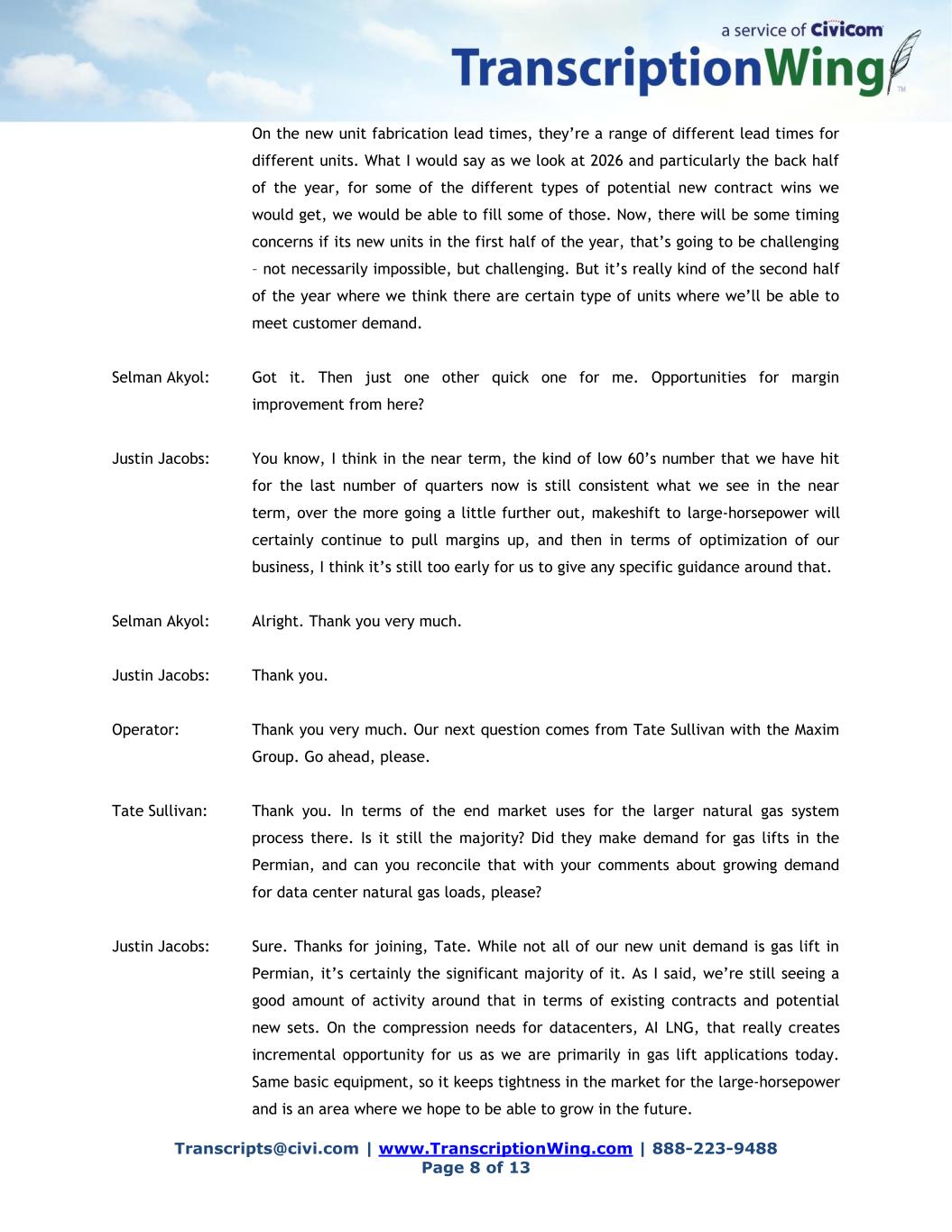 Transcripts@civi.com | www.TranscriptionWing.com | 888-223-9488 Page 8 of 13 On the new unit fabrication lead times, they’re a range of different lead times for different units. What I would say as we look at 2026 and particularly the back half of the year, for some of the different types of potential new contract wins we would get, we would be able to fill some of those. Now, there will be some timing concerns if its new units in the first half of the year, that’s going to be challenging – not necessarily impossible, but challenging. But it’s really kind of the second half of the year where we think there are certain type of units where we’ll be able to meet customer demand. Selman Akyol: Got it. Then just one other quick one for me. Opportunities for margin improvement from here? Justin Jacobs: You know, I think in the near term, the kind of low 60’s number that we have hit for the last number of quarters now is still consistent what we see in the near term, over the more going a little further out, makeshift to large-horsepower will certainly continue to pull margins up, and then in terms of optimization of our business, I think it’s still too early for us to give any specific guidance around that. Selman Akyol: Alright. Thank you very much. Justin Jacobs: Thank you. Operator: Thank you very much. Our next question comes from Tate Sullivan with the Maxim Group. Go ahead, please. Tate Sullivan: Thank you. In terms of the end market uses for the larger natural gas system process there. Is it still the majority? Did they make demand for gas lifts in the Permian, and can you reconcile that with your comments about growing demand for data center natural gas loads, please? Justin Jacobs: Sure. Thanks for joining, Tate. While not all of our new unit demand is gas lift in Permian, it’s certainly the significant majority of it. As I said, we’re still seeing a good amount of activity around that in terms of existing contracts and potential new sets. On the compression needs for datacenters, AI LNG, that really creates incremental opportunity for us as we are primarily in gas lift applications today. Same basic equipment, so it keeps tightness in the market for the large-horsepower and is an area where we hope to be able to grow in the future.