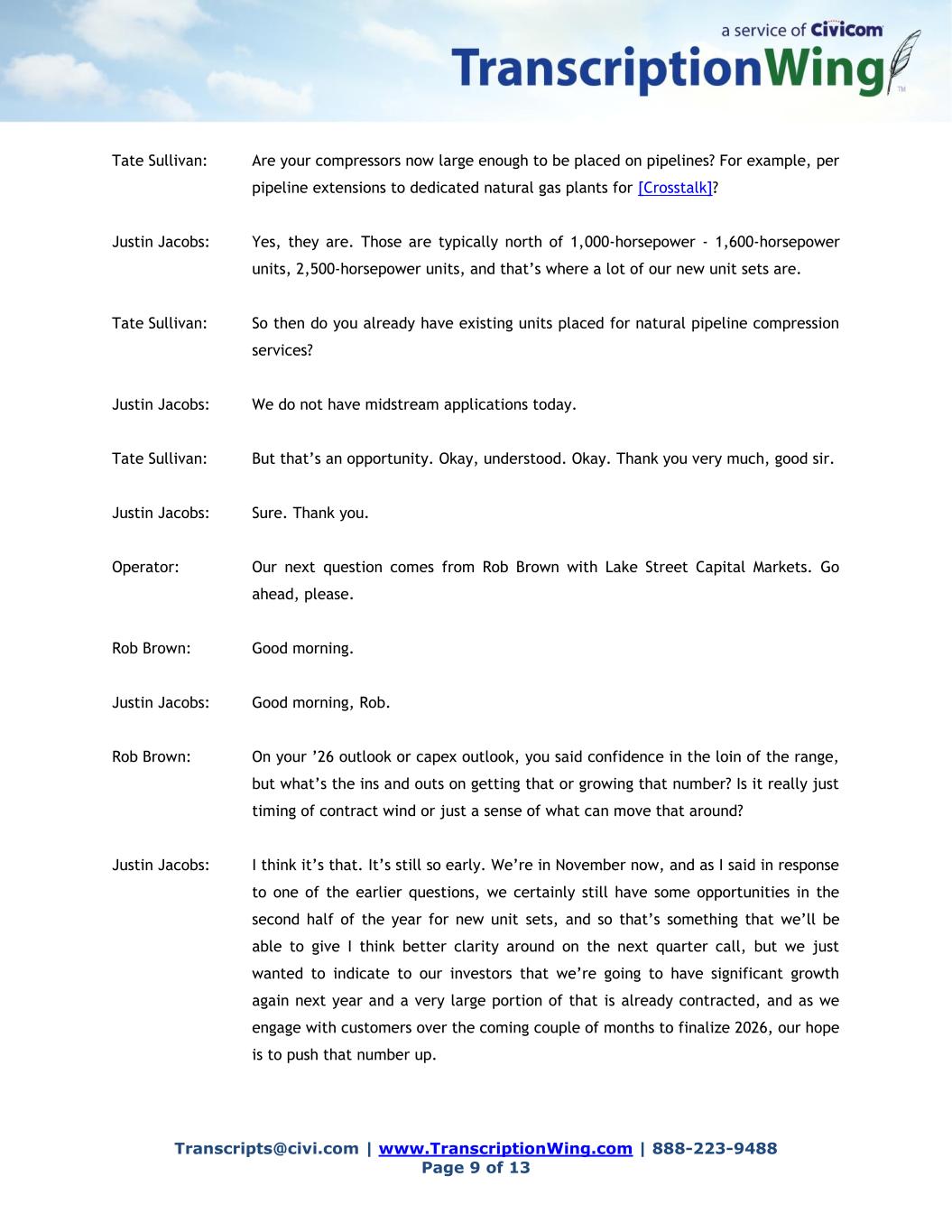 Transcripts@civi.com | www.TranscriptionWing.com | 888-223-9488 Page 9 of 13 Tate Sullivan: Are your compressors now large enough to be placed on pipelines? For example, per pipeline extensions to dedicated natural gas plants for [Crosstalk]? Justin Jacobs: Yes, they are. Those are typically north of 1,000-horsepower - 1,600-horsepower units, 2,500-horsepower units, and that’s where a lot of our new unit sets are. Tate Sullivan: So then do you already have existing units placed for natural pipeline compression services? Justin Jacobs: We do not have midstream applications today. Tate Sullivan: But that’s an opportunity. Okay, understood. Okay. Thank you very much, good sir. Justin Jacobs: Sure. Thank you. Operator: Our next question comes from Rob Brown with Lake Street Capital Markets. Go ahead, please. Rob Brown: Good morning. Justin Jacobs: Good morning, Rob. Rob Brown: On your ’26 outlook or capex outlook, you said confidence in the loin of the range, but what’s the ins and outs on getting that or growing that number? Is it really just timing of contract wind or just a sense of what can move that around? Justin Jacobs: I think it’s that. It’s still so early. We’re in November now, and as I said in response to one of the earlier questions, we certainly still have some opportunities in the second half of the year for new unit sets, and so that’s something that we’ll be able to give I think better clarity around on the next quarter call, but we just wanted to indicate to our investors that we’re going to have significant growth again next year and a very large portion of that is already contracted, and as we engage with customers over the coming couple of months to finalize 2026, our hope is to push that number up.