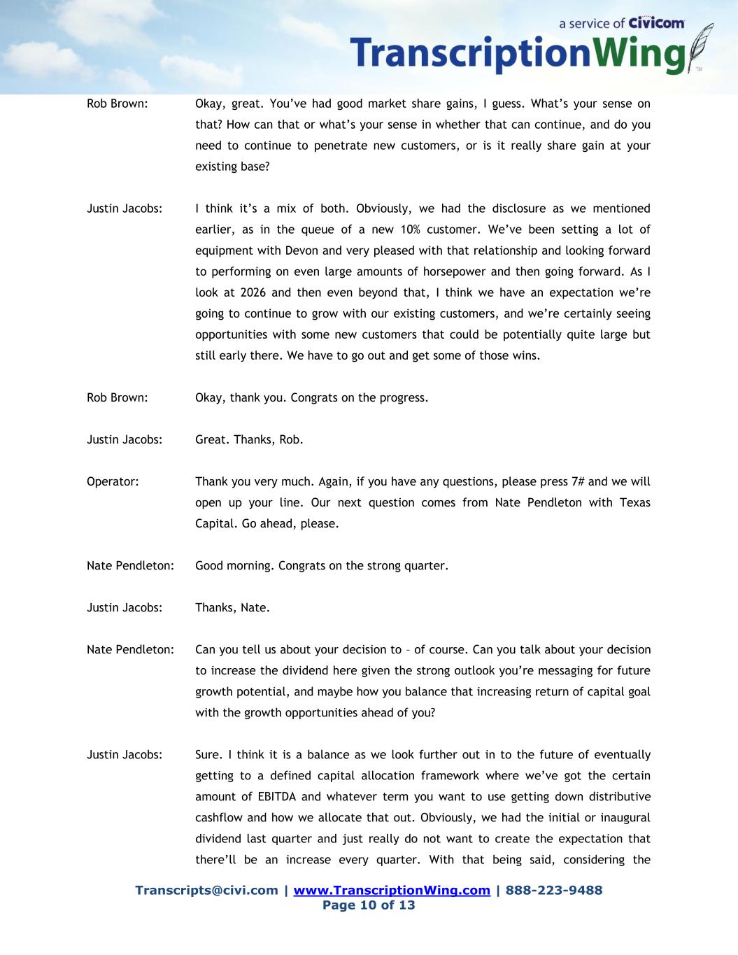Transcripts@civi.com | www.TranscriptionWing.com | 888-223-9488 Page 10 of 13 Rob Brown: Okay, great. You’ve had good market share gains, I guess. What’s your sense on that? How can that or what’s your sense in whether that can continue, and do you need to continue to penetrate new customers, or is it really share gain at your existing base? Justin Jacobs: I think it’s a mix of both. Obviously, we had the disclosure as we mentioned earlier, as in the queue of a new 10% customer. We’ve been setting a lot of equipment with Devon and very pleased with that relationship and looking forward to performing on even large amounts of horsepower and then going forward. As I look at 2026 and then even beyond that, I think we have an expectation we’re going to continue to grow with our existing customers, and we’re certainly seeing opportunities with some new customers that could be potentially quite large but still early there. We have to go out and get some of those wins. Rob Brown: Okay, thank you. Congrats on the progress. Justin Jacobs: Great. Thanks, Rob. Operator: Thank you very much. Again, if you have any questions, please press 7# and we will open up your line. Our next question comes from Nate Pendleton with Texas Capital. Go ahead, please. Nate Pendleton: Good morning. Congrats on the strong quarter. Justin Jacobs: Thanks, Nate. Nate Pendleton: Can you tell us about your decision to – of course. Can you talk about your decision to increase the dividend here given the strong outlook you’re messaging for future growth potential, and maybe how you balance that increasing return of capital goal with the growth opportunities ahead of you? Justin Jacobs: Sure. I think it is a balance as we look further out in to the future of eventually getting to a defined capital allocation framework where we’ve got the certain amount of EBITDA and whatever term you want to use getting down distributive cashflow and how we allocate that out. Obviously, we had the initial or inaugural dividend last quarter and just really do not want to create the expectation that there’ll be an increase every quarter. With that being said, considering the