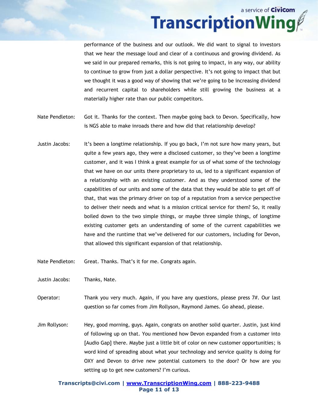 Transcripts@civi.com | www.TranscriptionWing.com | 888-223-9488 Page 11 of 13 performance of the business and our outlook. We did want to signal to investors that we hear the message loud and clear of a continuous and growing dividend. As we said in our prepared remarks, this is not going to impact, in any way, our ability to continue to grow from just a dollar perspective. It’s not going to impact that but we thought it was a good way of showing that we’re going to be increasing dividend and recurrent capital to shareholders while still growing the business at a materially higher rate than our public competitors. Nate Pendleton: Got it. Thanks for the context. Then maybe going back to Devon. Specifically, how is NGS able to make inroads there and how did that relationship develop? Justin Jacobs: It’s been a longtime relationship. If you go back, I’m not sure how many years, but quite a few years ago, they were a disclosed customer, so they’ve been a longtime customer, and it was I think a great example for us of what some of the technology that we have on our units there proprietary to us, led to a significant expansion of a relationship with an existing customer. And as they understood some of the capabilities of our units and some of the data that they would be able to get off of that, that was the primary driver on top of a reputation from a service perspective to deliver their needs and what is a mission critical service for them? So, it really boiled down to the two simple things, or maybe three simple things, of longtime existing customer gets an understanding of some of the current capabilities we have and the runtime that we’ve delivered for our customers, including for Devon, that allowed this significant expansion of that relationship. Nate Pendleton: Great. Thanks. That’s it for me. Congrats again. Justin Jacobs: Thanks, Nate. Operator: Thank you very much. Again, if you have any questions, please press 7#. Our last question so far comes from Jim Rollyson, Raymond James. Go ahead, please. Jim Rollyson: Hey, good morning, guys. Again, congrats on another solid quarter. Justin, just kind of following up on that. You mentioned how Devon expanded from a customer into [Audio Gap] there. Maybe just a little bit of color on new customer opportunities; is word kind of spreading about what your technology and service quality is doing for OXY and Devon to drive new potential customers to the door? Or how are you setting up to get new customers? I’m curious.