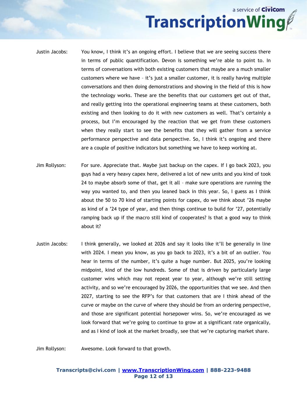 Transcripts@civi.com | www.TranscriptionWing.com | 888-223-9488 Page 12 of 13 Justin Jacobs: You know, I think it’s an ongoing effort. I believe that we are seeing success there in terms of public quantification. Devon is something we’re able to point to. In terms of conversations with both existing customers that maybe are a much smaller customers where we have – it’s just a smaller customer, it is really having multiple conversations and then doing demonstrations and showing in the field of this is how the technology works. These are the benefits that our customers get out of that, and really getting into the operational engineering teams at these customers, both existing and then looking to do it with new customers as well. That’s certainly a process, but I’m encouraged by the reaction that we get from these customers when they really start to see the benefits that they will gather from a service performance perspective and data perspective. So, I think it’s ongoing and there are a couple of positive indicators but something we have to keep working at. Jim Rollyson: For sure. Appreciate that. Maybe just backup on the capex. If I go back 2023, you guys had a very heavy capex here, delivered a lot of new units and you kind of took 24 to maybe absorb some of that, get it all – make sure operations are running the way you wanted to, and then you leaned back in this year. So, I guess as I think about the 50 to 70 kind of starting points for capex, do we think about ’26 maybe as kind of a ’24 type of year, and then things continue to build for ’27, potentially ramping back up if the macro still kind of cooperates? Is that a good way to think about it? Justin Jacobs: I think generally, we looked at 2026 and say it looks like it’ll be generally in line with 2024. I mean you know, as you go back to 2023, it’s a bit of an outlier. You hear in terms of the number, it’s quite a huge number. But 2025, you’re looking midpoint, kind of the low hundreds. Some of that is driven by particularly large customer wins which may not repeat year to year, although we’re still setting activity, and so we’re encouraged by 2026, the opportunities that we see. And then 2027, starting to see the RFP’s for that customers that are I think ahead of the curve or maybe on the curve of where they should be from an ordering perspective, and those are significant potential horsepower wins. So, we’re encouraged as we look forward that we’re going to continue to grow at a significant rate organically, and as I kind of look at the market broadly, see that we’re capturing market share. Jim Rollyson: Awesome. Look forward to that growth.