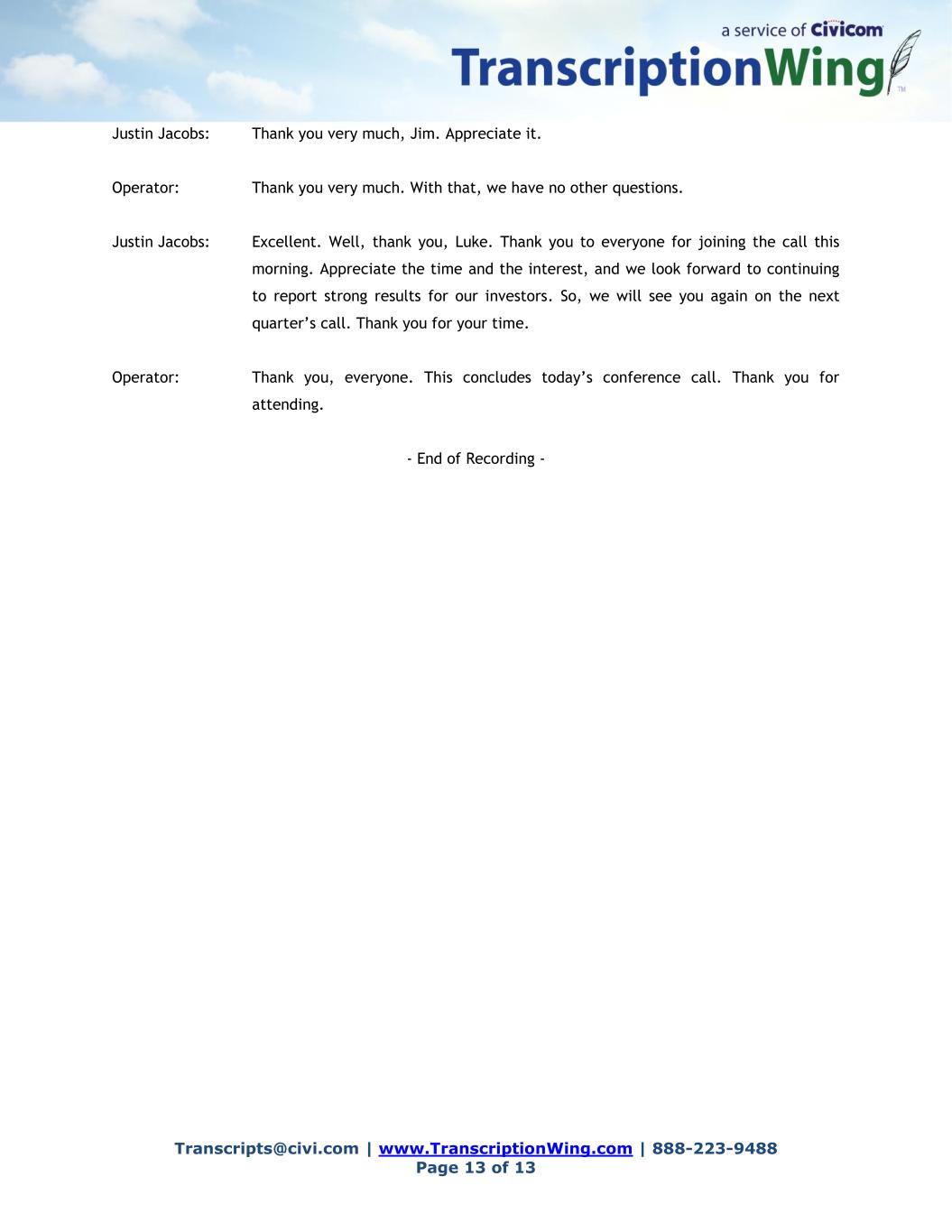 Transcripts@civi.com | www.TranscriptionWing.com | 888-223-9488 Page 13 of 13 Justin Jacobs: Thank you very much, Jim. Appreciate it. Operator: Thank you very much. With that, we have no other questions. Justin Jacobs: Excellent. Well, thank you, Luke. Thank you to everyone for joining the call this morning. Appreciate the time and the interest, and we look forward to continuing to report strong results for our investors. So, we will see you again on the next quarter’s call. Thank you for your time. Operator: Thank you, everyone. This concludes today’s conference call. Thank you for attending. - End of Recording -