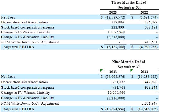 Below is a reconciliation of Adjusted EBITDA to net loss for the three months ended September 30, 2023 and 2022 and for the nine months ended September 30, 2023 and 2022, respectively: