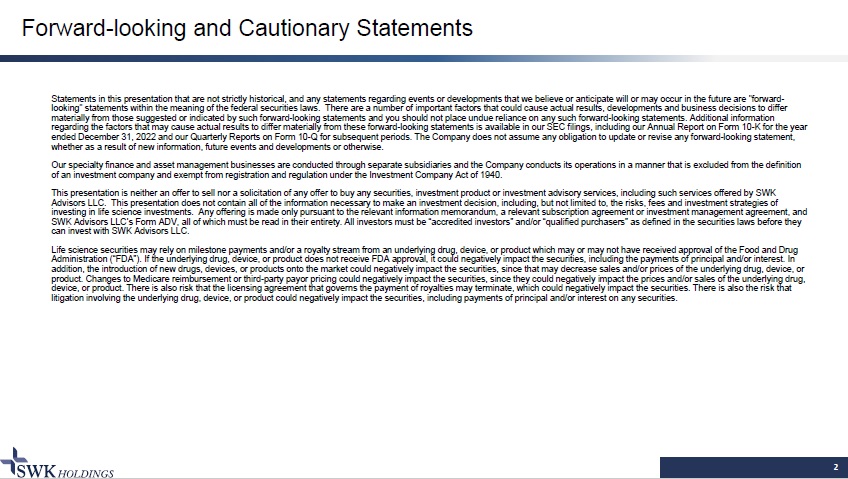 2 Forward - looking and Cautionary Statements Statements in this presentation that are not strictly historical, and any statements regarding events or developments that we be lieve or anticipate will or may occur in the future are "forward - looking" statements within the meaning of the federal securities laws. There are a number of important factors that could cause actual results, developments and business decisions to differ materially from those suggested or indicated by such forward - looking statements and you should not place undue reliance on any s uch forward - looking statements. Additional information regarding the factors that may cause actual results to differ materially from these forward - looking statements is available in o ur SEC filings, including our Annual Report on Form 10 - K for the year ended December 31, 2022 and our Quarterly Reports on Form 10 - Q for subsequent periods. The Company does not assume any obligatio n to update or revise any forward - looking statement, whether as a result of new information, future events and developments or otherwise. Our specialty finance and asset management businesses are conducted through separate subsidiaries and the Company conducts it s o perations in a manner that is excluded from the definition of an investment company and exempt from registration and regulation under the Investment Company Act of 1940. This presentation is neither an offer to sell nor a solicitation of any offer to buy any securities, investment product or in ves tment advisory services, including such services offered by SWK Advisors LLC. This presentation does not contain all of the information necessary to make an investment decision, including, bu t not limited to, the risks, fees and investment strategies of investing in life science investments. Any offering is made only pursuant to the relevant information memorandum, a relevant su bscription agreement or investment management agreement, and SWK Advisors LLC’s Form ADV, all of which must be read in their entirety. All investors must be “accredited investors” and/or “q ualified purchasers” as defined in the securities laws before they can invest with SWK Advisors LLC. Life science securities may rely on milestone payments and/or a royalty stream from an underlying drug, device, or product wh ich may or may not have received approval of the Food and Drug Administration (“FDA”). If the underlying drug, device, or product does not receive FDA approval, it could negatively impact the securities, including the payments of principal and/or interest. In addition, the introduction of new drugs, devices, or products onto the market could negatively impact the securities, since t hat may decrease sales and/or prices of the underlying drug, device, or product. Changes to Medicare reimbursement or third - party payor pricing could negatively impact the securities, since they could negatively impact the prices and/or sales of the underlying drug, device, or product. There is also risk that the licensing agreement that governs the payment of royalties may terminate, whic h c ould negatively impact the securities. There is also the risk that litigation involving the underlying drug, device, or product could negatively impact the securities, including payments of pr inc ipal and/or interest on any securities.
