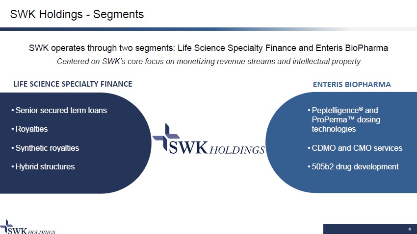 SWK Holdings - Overview 3 Underserved, High - Need Market Demonstrated Success, Attractive Returns Focus on Shareholder Returns Custom financing solutions for commercial - stage healthcare companies and royalty owners • SWK targets $5mm to $25mm financings, a market niche that is largely ignored by larger market participants and generates attractive full - cycle returns • Business focus is secured financings and royalty monetizations • Experienced and aligned management and Board with extensive life science network • As of March 17, 2023, completed financings with 50 parties deploying $725mm of capital • Targets unlevered, mid - teens gross return on capital with a portfolio effective yield of 13.9% for 4Q22 • 31 exits from inception through December 31, 2022 generating an ~18% IRR and 1.4x MOIC • Specialty finance segment generated a 9.9% LTM adjusted return on finance segment tangible book value** • Compounded book value per share at a ~10% CAGR from 4Q12 to 4Q22’s $21.80 • Demonstrated shareholder value creation: Share repurchases, NASDAQ uplisting , and Enteris strategic review • Shareholder value creation strategy: – Increase book value per share at a 10% CAGR – Serve as partner of choice for small and mid - sized life sciences companies and inventors – Generate current income to utilize SWK’s substantial NOL asset, $124.5mm as of December 31, 2022 * Effective yield is the rate at which income is expected to be recognized pursuant to the Company’s revenue recognition poli cie s, if all payments are received pursuant to the terms of the finance receivable; excludes warrants ** Numerator is specialty finance division’s adjusted non - GAAP net income; Denominator is shareholders equity less the deferred tax asset and Enteris PP&E and net intangibles and goodwill, which adds - back the contingent consideration payable
