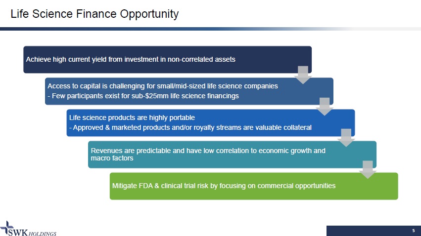 4 SWK Holdings - Segments LIFE SCIENCE SPECIALTY FINANCE ENTERIS BIOPHARMA • Senior secured term loans • Royalties • Synthetic royalties • Hybrid structures • Peptelligence ® and ProPerma Œ dosing technologies • CDMO and CMO services • 505b2 drug development SWK operates through two segments: Life Science Specialty Finance and Enteris BioPharma Centered on SWK’s core focus on monetizing revenue streams and intellectual property