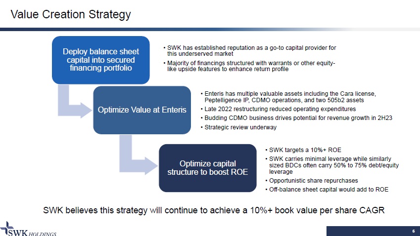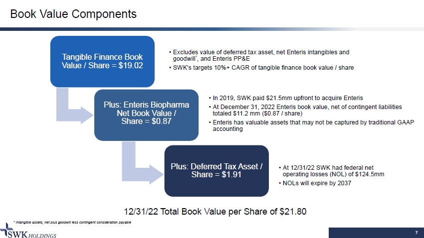 6 Value Creation Strategy Deploy balance sheet capital into secured financing portfolio • SWK has established reputation as a go - to capital provider for this underserved market • Majority of financings structured with warrants or other equity - like upside features to enhance return profile Optimize Value at Enteris • Enteris has multiple valuable assets including the Cara license, Peptelligence IP, CDMO operations, and two 505b2 assets • Late 2022 restructuring reduced operating expenditures • Budding CDMO business drives potential for revenue growth in 2H23 • Strategic review underway Optimize capital structure to boost ROE • SWK targets a 10%+ ROE • SWK carries minimal leverage while similarly sized BDCs often carry 50% to 75% debt/equity leverage • Opportunistic share repurchases • Off - balance sheet capital would add to ROE SWK believes this strategy will continue to achieve a 10%+ book value per share CAGR