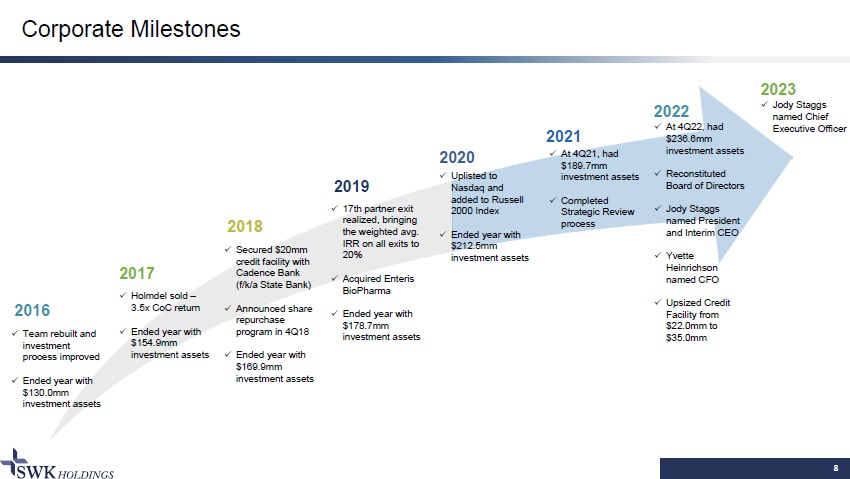 7 Book Value Components Tangible Finance Book Value / Share = $19.02 • Excludes value of deferred tax asset, net Enteris intangibles and goodwill * , and Enteris PP&E • SWK’s targets 10%+ CAGR of tangible finance book value / share Plus: Enteris Biopharma Net Book Value / Share = $0.87 • In 2019, SWK paid $21.5mm upfront to acquire Enteris • At December 31, 2022 Enteris book value, net of contingent liabilities totaled $11.2 mm ($0.87 / share) • Enteris has valuable assets that may not be captured by traditional GAAP accounting Plus: Deferred Tax Asset / Share = $1.91 • At 12/31/22 SWK had federal net operating losses (NOL) of $124.5mm • NOLs will expire by 2037 12/31/22 Total Book Value per Share of $21.80 * Intangible assets, net plus goodwill less contingent consideration payable