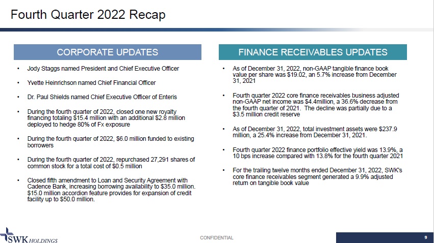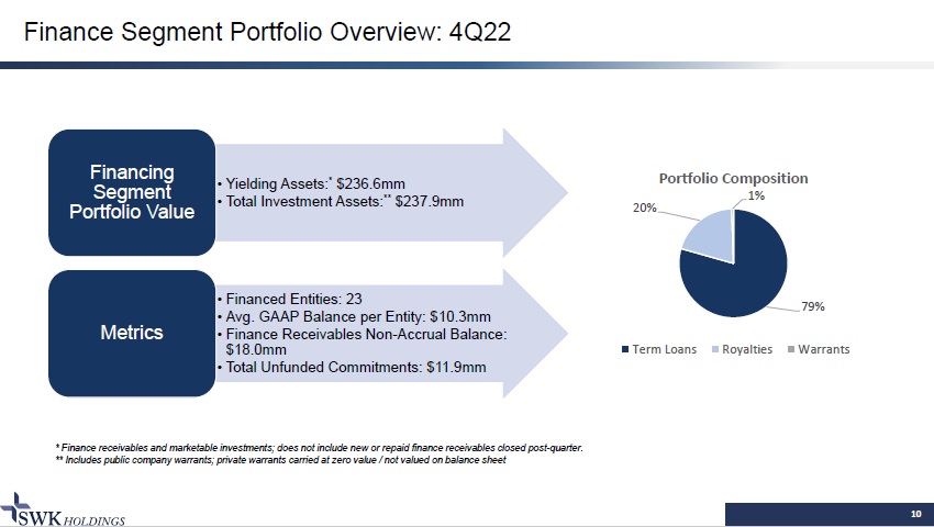 Fourth Quarter 2022 Recap 9 CONFIDENTIAL CORPORATE UPDATES FINANCE RECEIVABLES UPDATES • Jody Staggs named President and Chief Executive Officer • Yvette Heinrichson named Chief Financial Officer • Dr. Paul Shields named Chief Executive Officer of Enteris • During the fourth quarter of 2022, closed one new royalty financing totaling $15.4 million with an additional $2.8 million deployed to hedge 80% of Fx exposure • During the fourth quarter of 2022, $6.0 million funded to existing borrowers • During the fourth quarter of 2022, repurchased 27,291 shares of common stock for a total cost of $0.5 million • Closed fifth amendment to Loan and Security Agreement with Cadence Bank, increasing borrowing availability to $35.0 million. $15.0 million accordion feature provides for expansion of credit facility up to $50.0 million. • As of December 31, 2022, non - GAAP tangible finance book value per share was $19.02, an 5.7% increase from December 31, 2021 • Fourth quarter 2022 core finance receivables business adjusted non - GAAP net income was $4.4million, a 36.6% decrease from the fourth quarter of 2021. The decline was partially due to a $3.5 million credit reserve • As of December 31, 2022, total investment assets were $237.9 million, a 25.4% increase from December 31, 2021. • Fourth quarter 2022 finance portfolio effective yield was 13.9%, a 10 bps increase compared with 13.8% for the fourth quarter 2021 • For the trailing twelve months ended December 31, 2022, SWK's core finance receivables segment generated a 9.9% adjusted return on tangible book value