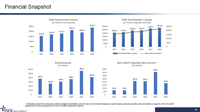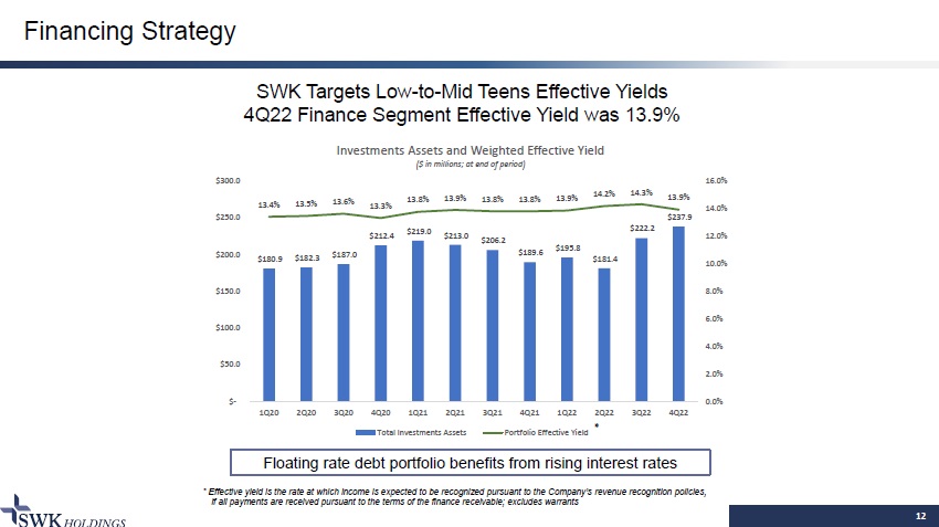 11 Financial Snapshot * Eliminates provision for income taxes, Enteris intangibles amortization, and non - cash mark - to - market changes on warrant assets and equity securities; see reconciliation on page 30; 2019 Non - GAAP Adjusted Net Income was reduced by $1.2mm of Enteris transaction expenses $208.0 $213.1 $236.5 $240.5 $267.2 $279.9 $- $5.00 $10.00 $15.00 $20.00 $25.00 $- $50.0 $100.0 $150.0 $200.0 $250.0 $300.0 2017 2018 2019 2020 2021 2022 SWK Stockholder's Equity ($ in millions; except per share data) SWK Stockholders' Equity Book Value per Share $154.9 $169.9 $178.7 $212.5 $189.7 $237.9 $- $50.0 $100.0 $150.0 $200.0 $250.0 2017 2018 2019 2020 2021 2022 Total Investments Assets ($ in millions; at end of period) $37.5 $26.0 $30.7 $36.7 $56.2 $41.5 $- $10.0 $20.0 $30.0 $40.0 $50.0 $60.0 2017 2018 2019 2020 2021 2022 Total Revenue ($ in millions) $6.8 $6.8 $21.4 $21.1 $35.7 $18.1 $- $5.0 $10.0 $15.0 $20.0 $25.0 $30.0 $35.0 $40.0 2017 2018 2019 2020 2021 2022 Non - GAAP Adjusted Net Income* ($ in millions)