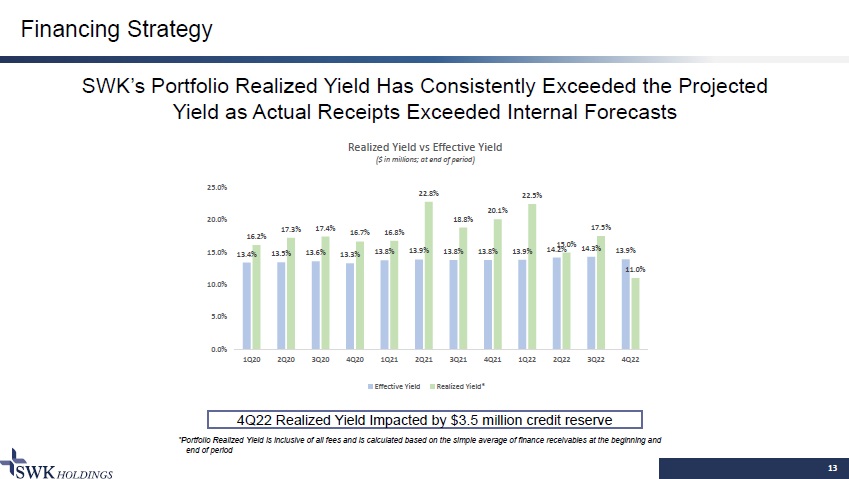 12 Financing Strategy SWK Targets Low - to - Mid Teens Effective Yields 4Q22 Finance Segment Effective Yield was 13.9% * Effective yield is the rate at which income is expected to be recognized pursuant to the Company’s revenue recognition poli cie s, if all payments are received pursuant to the terms of the finance receivable; excludes warrants Floating rate debt portfolio benefits from rising interest rates $180.9 $182.3 $187.0 $212.4 $219.0 $213.0 $206.2 $189.6 $195.8 $181.4 $222.2 $237.9 13.4% 13.5% 13.6% 13.3% 13.8% 13.9% 13.8% 13.8% 13.9% 14.2% 14.3% 13.9% 0.0% 2.0% 4.0% 6.0% 8.0% 10.0% 12.0% 14.0% 16.0% $- $50.0 $100.0 $150.0 $200.0 $250.0 $300.0 1Q20 2Q20 3Q20 4Q20 1Q21 2Q21 3Q21 4Q21 1Q22 2Q22 3Q22 4Q22 Investments Assets and Weighted Effective Yield ($ in millions; at end of period) Total Investments Assets Portfolio Effective Yield *