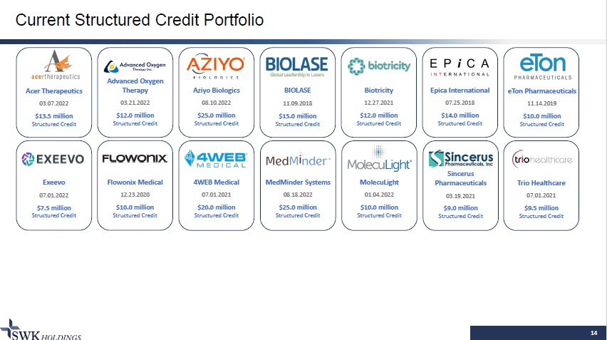 13 Financing Strategy SWK’s Portfolio Realized Yield Has Consistently Exceeded the Projected Yield as Actual Receipts Exceeded Internal Forecasts *Portfolio Realized Yield is inclusive of all fees and is calculated based on the simple average of finance receivables at th e b eginning and end of period 13.4% 13.5% 13.6% 13.3% 13.8% 13.9% 13.8% 13.8% 13.9% 14.2% 14.3% 13.9% 16.2% 17.3% 17.4% 16.7% 16.8% 22.8% 18.8% 20.1% 22.5% 15.0% 17.5% 11.0% 0.0% 5.0% 10.0% 15.0% 20.0% 25.0% 1Q20 2Q20 3Q20 4Q20 1Q21 2Q21 3Q21 4Q21 1Q22 2Q22 3Q22 4Q22 Realized Yield vs Effective Yield ($ in millions; at end of period) Effective Yield Realized Yield* 4Q22 Realized Yield Impacted by $3.5 million credit reserve