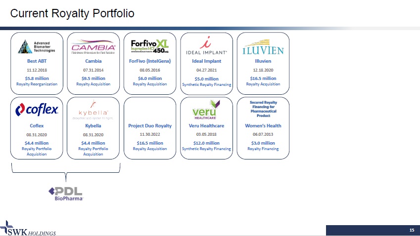 14 Current Structured Credit Portfolio Trio Healthcare 07.01.2021 $9.5 million Structured Credit Advanced Oxygen Therapy 03.21.2022 $12.0 million Structured Credit Aziyo Biologics 08.10.2022 $25.0 million Structured Credit BIOLASE 11.09.2018 $15.0 million Structured Credit Biotricity 12.27.2021 $12.0 million Structured Credit Epica International 07.25.2018 $14.0 million Structured Credit eTon Pharmaceuticals 11.14.2019 $10.0 million Structured Credit Flowonix Medical 12.23.2020 $10.0 million Structured Credit 4WEB Medical 07.01.2021 $20.0 million Structured Credit MedMinder Systems 08.18.2022 $25.0 million Structured Credit MolecuLight 01.04.2022 $10.0 million Structured Credit Sincerus Pharmaceuticals 03.19.2021 $9.0 million Structured Credit Acer Therapeutics 03.07.2022 $13.5 million Structured Credit Exeevo 07.01.2022 $7.5 million Structured Credit