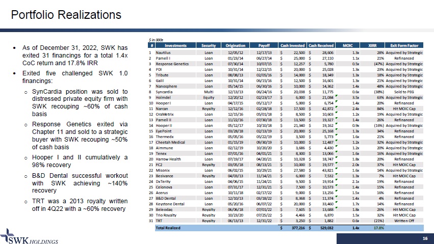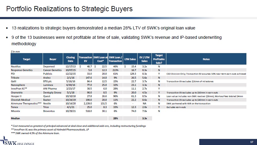 16 Portfolio Realizations $ in 000s # Investments Security Origination Payoff Cash Invested Cash Received MOIC XIRR Exit Form Factor 1 Nautilus Loan 12/05/12 12/17/13 22,500$ 28,606$ 1.3x 28%Acquired by Strategic 2 Parnell I Loan 01/23/14 06/27/14 25,000$ 27,110$ 1.1x 21% Refinanced 3 Response Genetics Loan 07/30/14 10/07/15 12,257$ 5,780$ 0.5x (47%)Acquired by Strategic 4 PDI Loan 10/31/14 12/22/15 20,000$ 25,028$ 1.3x 23%Acquired by Strategic 5 Tribute Loan 08/08/13 02/05/16 14,000$ 18,349$ 1.3x 18%Acquired by Strategic 6 Galil Loan 10/31/14 06/15/16 12,500$ 16,601$ 1.3x 21%Acquired by Strategic 7 Nanosphere Loan 05/14/15 06/30/16 10,000$ 14,362$ 1.4x 48%Acquired by Strategic 8 Syncardia Multi 12/13/13 06/24/16 20,038$ 11,775$ 0.6x (38%) Sold to PEG 9 Holmdel Equity 12/20/12 02/23/17 6,000$ 21,084$ 3.5x 63%Acquired by Strategic 10 Hooper I Loan 04/17/15 05/12/17 5,000$ 6,754$ 1.4x 20% Refinanced 11 Narcan Royalty 12/12/16 02/28/18 17,500$ 42,872$ 2.4x 84% Hit MOIC Cap 12 OraMetrix Loan 12/15/16 05/01/18 8,500$ 10,603$ 1.2x 19%Acquired by Strategic 13 Parnell II Loan 11/22/16 07/30/18 13,500$ 19,327$ 1.4x 26% Refinanced 14 Hooper II Loan 05/12/17 10/10/18 21,340$ 19,162$ 0.9x (16%)Acquired by Strategic 15 EyePoint Loan 03/28/18 02/13/19 20,000$ 25,168$ 1.3x 34% Refinanced 16 Thermedx Loan 05/05/16 05/22/19 3,500$ 5,773$ 1.6x 21% Refinanced 17 Cheetah Medical Loan 01/15/19 09/30/19 10,000$ 12,487$ 1.2x 32%Acquired by Strategic 18 Aimmune Loan 02/12/19 10/20/20 3,686$ 4,430$ 1.2x 20%Acquired by Strategic 19 Tenex Loan 07/01/16 04/01/21 8,300$ 13,066$ 1.6x 16%Acquired by Strategic 20 Harrow Health Loan 07/19/17 04/20/21 10,328$ 18,747$ 1.8x 20% Refinanced 21 FC2 Royalty 03/05/18 08/13/21 10,000$ 19,577$ 2.0x 37% Hit MOIC Cap 22 Misonix Loan 06/02/15 10/29/21 27,580$ 43,821$ 1.6x 14%Acquired by Strategic 23 Besivance Royalty 04/03/13 11/14/21 6,000$ 7,532$ 1.3x 7% Hit MOIC Cap 24 DxTerity Loan 04/06/15 11/24/21 9,500$ 19,914$ 2.1x 19% Refinanced 25 Celonova Loan 07/31/17 12/31/21 7,500$ 10,573$ 1.4x 15% Refinanced 26 Acerus Loan 10/11/18 02/17/22 9,000$ 13,256$ 1.5x 16% Refinanced 27 B&D Dental Loan 12/10/13 03/18/22 8,368$ 11,374$ 1.4x 4% Refinanced 28 Keystone Dental Loan 05/20/16 06/07/22 20,000$ 33,460$ 1.7x 14% Refinanced 29 Beleodaq Royalty 06/06/18 07/01/22 7,605$ 13,688$ 1.8x 26% Hit MOIC Cap 30 Trio Royalty Royalty 10/23/20 07/25/22 4,466$ 6,870$ 1.5x 32% Hit MOIC Cap 31 TRT Royalty 06/13/13 12/31/22 3,250$ 1,882$ 0.6x (21%) Written Off Total Realized 377,216$ 529,032$ 1.4x 17.8% As of December 31 , 2022 , SWK has exited 31 financings for a total 1 . 4 x CoC return and 17 . 8 % IRR Exited five challenged SWK 1 . 0 financings : o SynCardia position was sold to distressed private equity firm with SWK recouping ~ 60 % of cash basis o Response Genetics exited via Chapter 11 and sold to a strategic buyer with SWK recouping ~ 50 % of cash basis o Hooper I and II cumulatively a 98 % recovery o B&D Dental successful workout with SWK achieving ~ 140 % recovery o TRT was a 2013 royalty written off in 4 Q 22 with a ~ 60 % recovery
