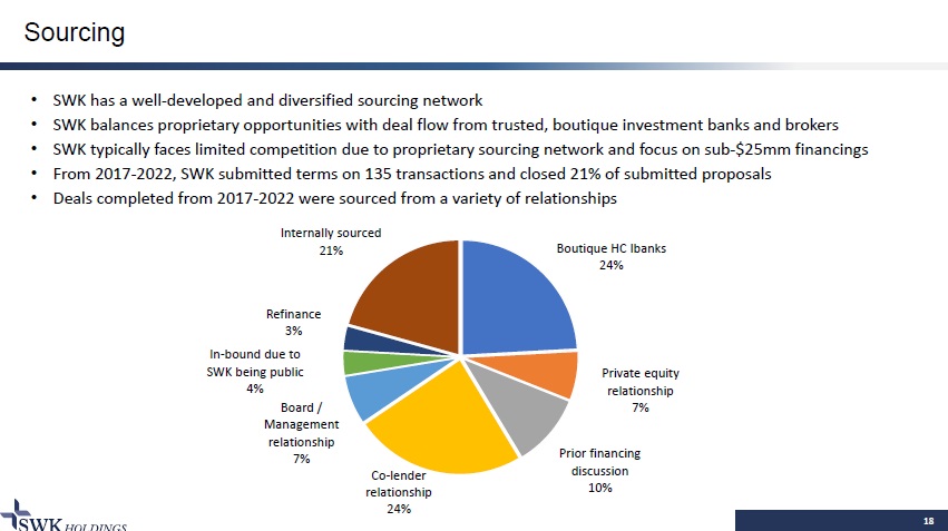 17 Portfolio Realizations to Strategic Buyers 13 realizations to strategic buyers demonstrated a median 28% LTV of SWK’s original loan value 9 of the 13 businesses were not profitable at time of sale, validating SWK’s revenue and IP - based underwriting methodology $ in mm Target Buyer Closing Date Transaction EV SWK Loan at Cost* SWK Loan / Transaction LTM Sales EV / LTM Sales Target Profitable Sale? Notes Nautilus Depomed 12/17/13 48.7$ 22.5$ 46% 15.4$ 3.2x N Response Genetics Cancer Genetics 10/07/15 5.8 12.3 213% 16.7 0.3x N PDI Publicis 12/22/15 33.0 20.0 61% 129.3 0.3x Y CSO Division Only; Transaction EV assumes 50% near-term earn-outs achieved Tribute Aralez 2/1/16 147.6 14.0 9% 26.5 5.6x N Galil BTG plc 5/16/16 84.4 12.5 15% 22.7 3.7x N Transaction EV excludes $26mm of milestones Nanosphere Luminex 6/30/16 77.0 25.0 32% 23.1 3.3x N InnoPran XL** ANI Pharma 2/23/17 30.5 6.0 28% 11.1 2.7x Y Orametrix Dentsply Sirona 5/1/18 90.0 8.5 9% 20.0 4.5x Y Transaction EV excludes up to $60mm in earn-outs Hooper II Quest 10/10/18 27.8 26.6 96% 61.3 0.5x N Loan value includes non-SWK revolver ($8mm); Workout fees totaled $4mm Cheetah Medical Baxter 10/24/19 190.0 20.0 11% 22.2 8.6x N Transaction EV excludes up to $40mm in earn-outs Aimmune Therapeutics*** Nestle 10/14/20 2,139.0 131.5 6% - NA N SWK partnered with KKR on the transaction Tenex Trice 4/1/21 25.0 8.3 33% 12.3 2.0x Y Excludes earn-outs Misonix Bioventus 10/29/21 518.0 30.1 6% 74.0 7.0x N Median 28% 3.3x * Cost measured as greatest of principal advanced at deal close and additional add-ons, including restructuring fundings ** InnoPran XL was the primary asset of Holmdel Pharmaceuticals, LP *** SWK owned 4.5% of the Aimmune loan.