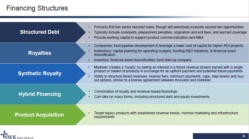 18 Sourcing • SWK has a well - developed and diversified sourcing network • SWK balances proprietary opportunities with deal flow from trusted, boutique investment banks and brokers • SWK typically faces limited competition due to proprietary sourcing network and focus on sub - $25mm financings • From 2017 - 2022, SWK submitted terms on 135 transactions and closed 21% of submitted proposals • Deals completed from 2017 - 2022 were sourced from a variety of relationships Boutique HC Ibanks 24% Private equity relationship 7% Prior financing discussion 10% Co - lender relationship 24% Board / Management relationship 7% In - bound due to SWK being public 4% Refinance 3% Internally sourced 21%