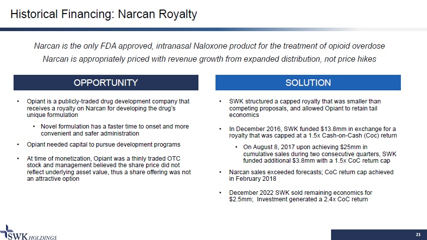 Historical Financing: Narcan Royalty 21 OPPORTUNITY SOLUTION • Opiant is a publicly - traded drug development company that receives a royalty on Narcan for developing the drug’s unique formulation • Novel formulation has a faster time to onset and more convenient and safer administration • Opiant needed capital to pursue development programs • At time of monetization, Opiant was a thinly traded OTC stock and management believed the share price did not reflect underlying asset value, thus a share offering was not an attractive option • SWK structured a capped royalty that was smaller than competing proposals, and allowed Opiant to retain tail economics • In December 2016, SWK funded $13.8mm in exchange for a royalty that was capped at a 1.5x Cash - on - Cash (Coc) return • On August 8, 2017 upon achieving $25mm in cumulative sales during two consecutive quarters, SWK funded additional $3.8mm with a 1.5x CoC return cap • Narcan sales exceeded forecasts; CoC return cap achieved in February 2018 • December 2022 SWK sold remaining economics for $2.5mm; Investment generated a 2.4x CoC return Narcan is the only FDA approved, intranasal Naloxone product for the treatment of opioid overdose Narcan is appropriately priced with revenue growth from expanded distribution, not price hikes