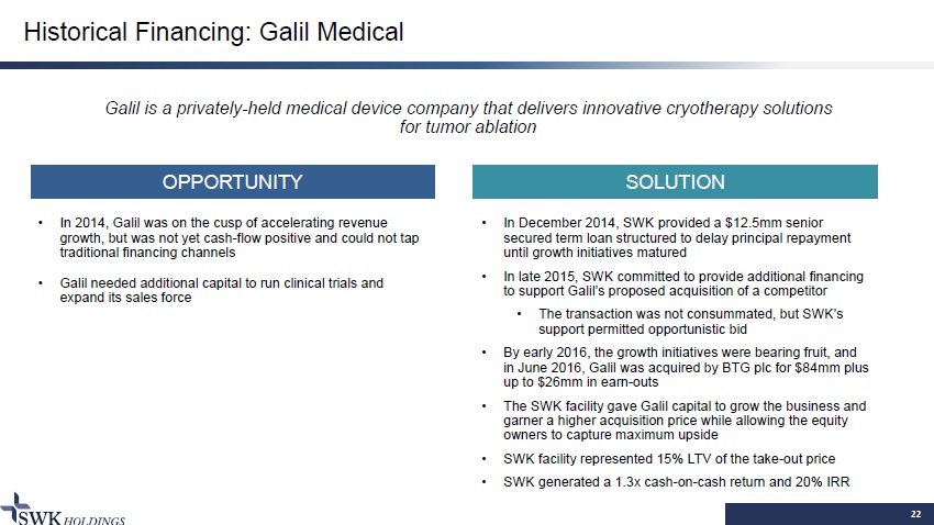 Historical Financing: Galil Medical 22 OPPORTUNITY SOLUTION • In 2014, Galil was on the cusp of accelerating revenue growth, but was not yet cash - flow positive and could not tap traditional financing channels • Galil needed additional capital to run clinical trials and expand its sales force • In December 2014, SWK provided a $12.5mm senior secured term loan structured to delay principal repayment until growth initiatives matured • In late 2015, SWK committed to provide additional financing to support Galil’s proposed acquisition of a competitor • The transaction was not consummated, but SWK’s support permitted opportunistic bid • By early 2016, the growth initiatives were bearing fruit, and in June 2016, Galil was acquired by BTG plc for $84mm plus up to $26mm in earn - outs • The SWK facility gave Galil capital to grow the business and garner a higher acquisition price while allowing the equity owners to capture maximum upside • SWK facility represented 15% LTV of the take - out price • SWK generated a 1.3x cash - on - cash return and 20% IRR Galil is a privately - held medical device company that delivers innovative cryotherapy solutions for tumor ablation