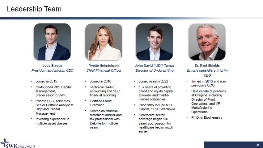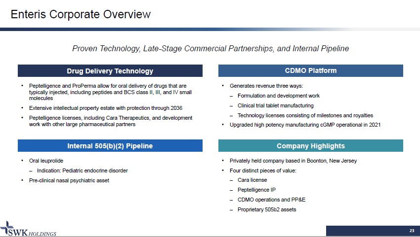 Enteris: Cara Therapeutics and Oral KORSUVA Œ 24 Oral KORSUVA Licensing Agreement Milestone Payment • Formulated with Enteris ’ Peptelligence technology • Currently the subject of three late - stage clinical trials for pruritus: • Phase 3 trial targeting pruritus associated with non - dialysis dependent advanced Chronic Kidney Disease • Phase 3 trial as an adjunctive therapy to topical corticosteroids for Atopic Dermatitis patients with moderate - to - severe pruritus • Phase 2/3 trial for treatment of moderate - to - severe pruritus in Notalgia paresthetica • Licensing agreement between Enteris and Cara announced in August 2019 • Non - exclusive, royalty - bearing license for Peptelligence to develop, manufacture and commercialize Oral KORSUVA worldwide, excluding Japan and South Korea • Enteris eligible to receive milestone payments and low single - digit royalties • Enteris has received a total of $33.0mm in upfront and milestones payments from Cara to date of which $12.4mm has been retained by SWK • The latest Cara milestone payment of $5.0mm was received in Q3 2022, with SWK retaining $2.5mm • SWK eligible to receive additional potential milestone payments subject to the achievement of certain development milestones Successful completion of Cara milestones will validate both the Peptelligence platform and the breadth and depth of Enteris’ comprehensive pharmaceutical capabilities