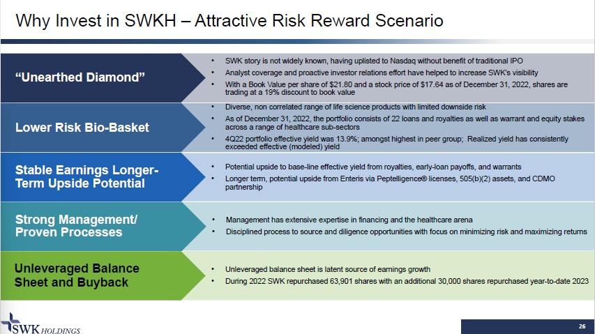 25 Leadership Team Yvette Heinrichson Chief Financial Officer • Joined in 2016 • Technical GAAP accounting and SEC financial reporting • Certified Fraud Examiner • Served as financial statement auditor and tax professional with Deloitte for multiple years Jody Staggs President and Interim CEO • Joined in 2015 • Co - founded PBS Capital Management, predecessor to SWK • Prior to PBS, served as Senior Portfolio Analyst at Highland Capital Management • Investing experience in multiple asset classes Dr. Paul Shields Enteris subsidiary interim CEO • Joined in 2013 and was previously COO • Held variety of positions at Unigene , including Director of Plant Operations, and VP Manufacturing Operations. • Ph.D. in Biochemstry John David (“JD”) Tamas Director of Underwriting • Joined in early 2022 • 15+ years of providing credit and equity capital to lower - and middle - market companies • Prior firms include NXT Capital, ORIX, Wachovia • Healthcare sector coverage began 10+ years ago, passion for healthcare began much earlier