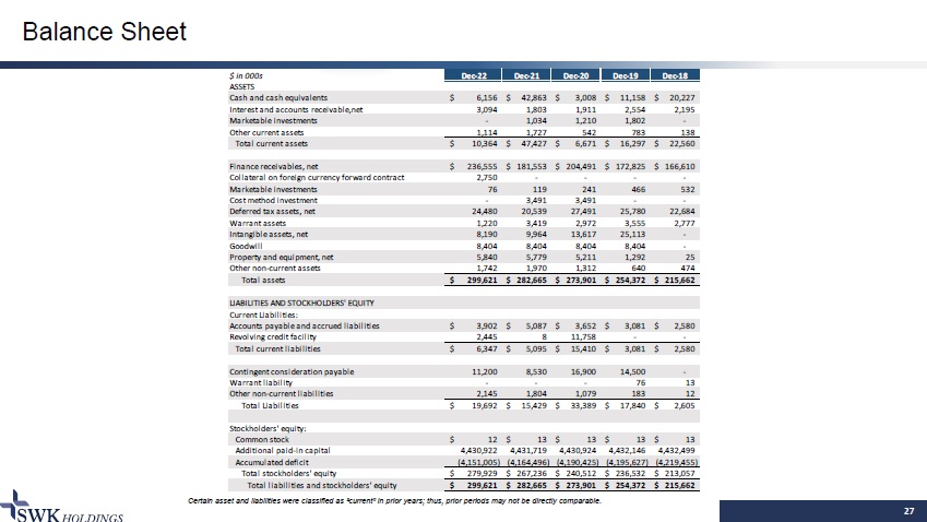 Why Invest in SWKH – Attractive Risk Reward Scenario 26 Unleveraged Balance Sheet and Buyback • SWK story is not widely known, having uplisted to Nasdaq without benefit of traditional IPO • Analyst coverage and proactive investor relations effort have helped to increase SWK’s visibility • With a Book Value per share of $21.80 and a stock price of $17.64 as of December 31, 2022, shares are trading at a 19% discount to book value Strong Management/ Proven Processes Stable Earnings Longer - Term Upside Potential Lower Risk Bio - Basket “Unearthed Diamond” • Diverse, non correlated range of life science products with limited downside risk • As of December 31, 2022, the portfolio consists of 22 loans and royalties as well as warrant and equity stakes across a range of healthcare sub - sectors • 4Q22 portfolio effective yield was 13.9%; amongst highest in peer group; Realized yield has consistently exceeded effective (modeled) yield • Potential upside to base - line effective yield from royalties, early - loan payoffs, and warrants • Longer term, potential upside from Enteris via Peptelligence® licenses, 505(b)(2) assets, and CDMO partnership • Management has extensive expertise in financing and the healthcare arena • Disciplined process to source and diligence opportunities with focus on minimizing risk and maximizing returns • Unleveraged balance sheet is latent source of earnings growth • During 2022 SWK repurchased 63,901 shares with an additional 30,000 shares repurchased year - to - date 2023