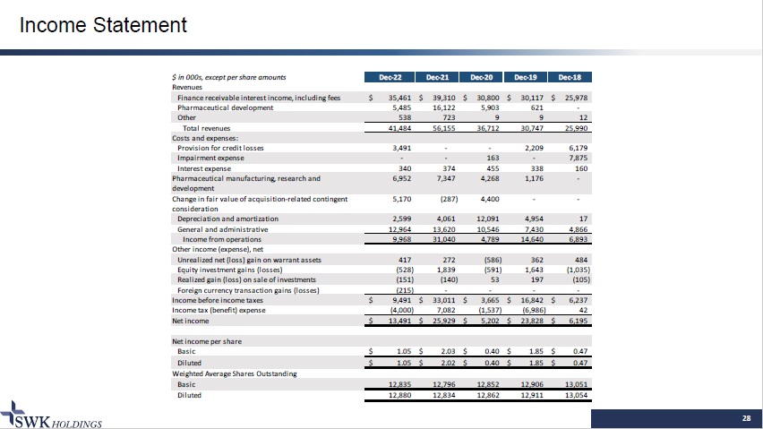 27 Balance Sheet Certain asset and liabilities were classified as “current” in prior years; thus, prior periods may not be directly comparable . $ in 000s Dec-22 Dec-21 Dec-20 Dec-19 Dec-18 ASSETS Cash and cash equivalents 6,156$ 42,863$ 3,008$ 11,158$ 20,227$ Interest and accounts receivable,net 3,094 1,803 1,911 2,554 2,195 Marketable investments (Equity) - 1,034 1,210 1,802 - Other current assets 1,114 1,727 542 783 138 Total current assets 10,364$ 47,427$ 6,671$ 16,297$ 22,560$ Finance receivables, net 236,555$ 181,553$ 204,491$ 172,825$ 166,610$ Collateral on foreign currency forward contract 2,750 - - - - Marketable investments (Osphena) 76 119 241 466 532 Cost method investment - 3,491 3,491 - - Deferred tax assets, net 24,480 20,539 27,491 25,780 22,684 Warrant assets 1,220 3,419 2,972 3,555 2,777 Intangible assets, net 8,190 9,964 13,617 25,113 - Goodwill 8,404 8,404 8,404 8,404 - Property and equipment, net 5,840 5,779 5,211 1,292 25 Other non-current assets 1,742 1,970 1,312 640 474 Total assets 299,621$ 282,665$ 273,901$ 254,372$ 215,662$ LIABILITIES AND STOCKHOLDERS' EQUITY Current Liabilities: Accounts payable and accrued liabilities 3,902$ 5,087$ 3,652$ 3,081$ 2,580$ Revolving credit facility 2,445 8 11,758 - - Total current liabilities 6,347$ 5,095$ 15,410$ 3,081$ 2,580$ Contingent consideration payable 11,200 8,530 16,900 14,500 - Warrant liability - - - 76 13 Other non-current liabilities 2,145 1,804 1,079 183 12 Total Liabilities 19,692$ 15,429$ 33,389$ 17,840$ 2,605$ Stockholders' equity: Common stock 12$ 13$ 13$ 13$ 13$ Additional paid-in capital 4,430,922 4,431,719 4,430,924 4,432,146 4,432,499 Accumulated deficit (4,151,005) (4,164,496) (4,190,425) (4,195,627) (4,219,455) Total stockholders' equity 279,929$ 267,236$ 240,512$ 236,532$ 213,057$ Total liabilities and stockholders' equity 299,621$ 282,665$ 273,901$ 254,372$ 215,662$