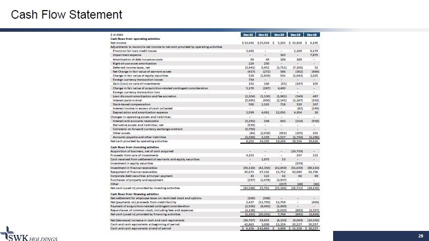 28 Income Statement $ in 000s, except per share amounts Dec-22 Dec-21 Dec-20 Dec-19 Dec-18 Revenues Finance receivable interest income, including fees 35,461$ 39,310$ 30,800$ 30,117$ 25,978$ Pharmaceutical development 5,485 16,122 5,903 621 - Other 538 723 9 9 12 Total revenues 41,484 56,155 36,712 30,747 25,990 Costs and expenses: Provision for credit losses 3,491 - - 2,209 6,179 Impairment expense - - 163 - 7,875 Interest expense 340 374 455 338 160 Pharmaceutical manufacturing, research and development 6,952 7,347 4,268 1,176 - Change in fair value of acquisition-related contingent consideration 5,170 (287) 4,400 - - Depreciation and amortization 2,599 4,061 12,091 4,954 17 General and administrative 12,964 13,620 10,546 7,430 4,866 Income from operations 9,968 31,040 4,789 14,640 6,893 Other income (expense), net Unrealized net (loss) gain on warrant assets 417 272 (586) 362 484 Equity investment gains (losses) (528) 1,839 (591) 1,643 (1,035) Realized gain (loss) on sale of investments (151) (140) 53 197 (105) Foreign currency transaction gains (losses) (215) - - - - Income before income taxes 9,491$ 33,011$ 3,665$ 16,842$ 6,237$ Income tax (benefit) expense (4,000) 7,082 (1,537) (6,986) 42 Net income 13,491$ 25,929$ 5,202$ 23,828$ 6,195$ Net income per share Basic 1.05$ 2.03$ 0.40$ 1.85$ 0.47$ Diluted 1.05$ 2.02$ 0.40$ 1.85$ 0.47$ Weighted Average Shares Outstanding Basic 12,835 12,796 12,852 12,906 13,051 Diluted 12,880 12,834 12,862 12,911 13,054