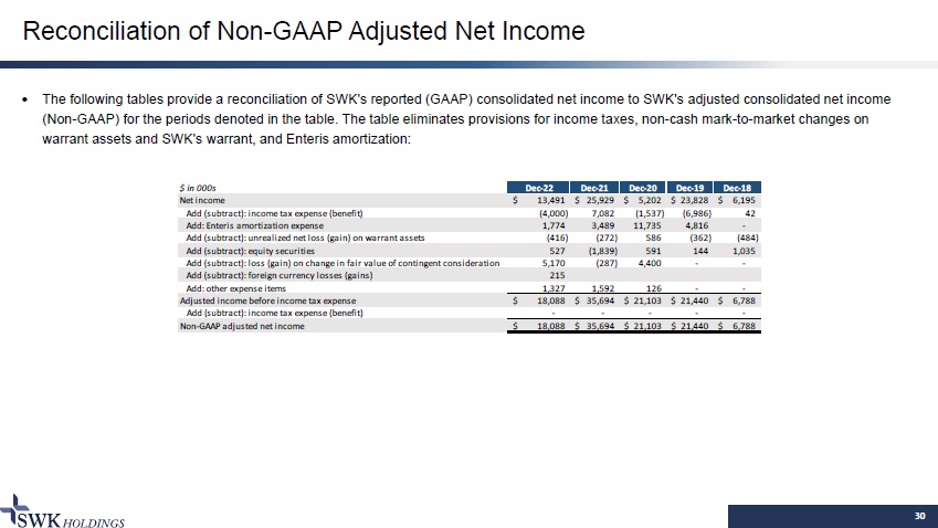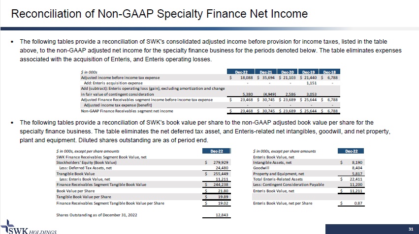 30 Reconciliation of Non - GAAP Adjusted Net Income The following tables provide a reconciliation of SWK's reported (GAAP) consolidated net income to SWK's adjusted consolidated ne t income (Non - GAAP) for the periods denoted in the table. The table eliminates provisions for income taxes, non - cash mark - to - market chang es on warrant assets and SWK's warrant, and Enteris amortization: $ in 000s Dec-22 Dec-21 Dec-20 Dec-19 Dec-18 Net income 13,491$ 25,929$ 5,202$ 23,828$ 6,195$ Add (subtract): income tax expense (benefit) (4,000) 7,082 (1,537) (6,986) 42 Add: Enteris amortization expense 1,774 3,489 11,735 4,816 - Add (subtract): unrealized net loss (gain) on warrant assets (416) (272) 586 (362) (484) Add (subtract): equity securities 527 (1,839) 591 144 1,035 Add (subtract): loss (gain) on change in fair value of contingent consideration 5,170 (287) 4,400 - - Add (subtract): foreign currency losses (gains) 215 Add: other expense items 1,327 1,592 126 - - Adjusted income before income tax expense 18,088$ 35,694$ 21,103$ 21,440$ 6,788$ Add (subtract): income tax expense (benefit) - - - - - Non-GAAP adjusted net income 18,088$ 35,694$ 21,103$ 21,440$ 6,788$