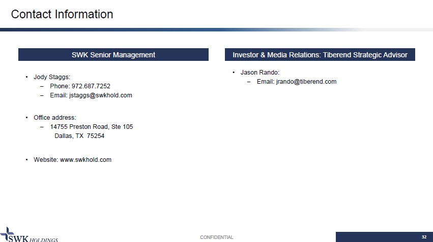 32 Contact Information CONFIDENTIAL SWK Senior Management Investor & Media Relations: Tiberend Strategic Advisor • Jody Staggs: ̶ Phone: 972.687.7252 ̶ Email: jstaggs@swkhold.com • Office address: ̶ 14755 Preston Road, Ste 105 Dallas, TX 75254 • Website: www.swkhold.com • Jason Rando: ̶ Email: jrando@tiberend.com
