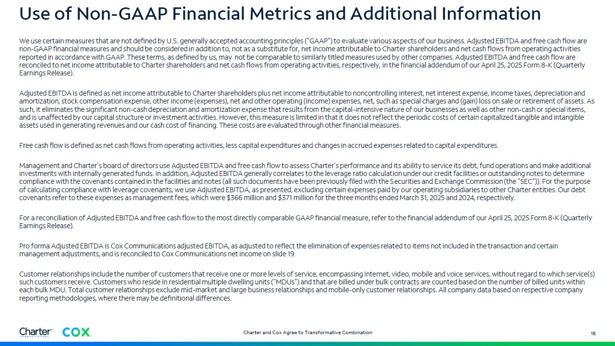 Use of Non-GAAP Financial Metrics and Additional Information  Charter and Cox Agree to Transformative Combination  18  We use certain measures that are not defined by U.S. generally accepted accounting principles ("GAAP") to evaluate various aspects of our business. Adjusted EBITDA and free cash flow are non-GAAP financial measures and should be considered in addition to, not as a substitute for, net income attributable to Charter shareholders and net cash flows from operating activities reported in accordance with GAAP. These terms, as defined by us, may not be comparable to similarly titled measures used by other companies. Adjusted EBITDA and free cash flow are reconciled to net income attributable to Charter shareholders and net cash flows from operating activities, respectively, in the financial addendum of our April 25, 2025 Form 8-K (Quarterly Earnings Release).  Adjusted EBITDA is defined as net income attributable to Charter shareholders plus net income attributable to noncontrolling interest, net interest expense, income taxes, depreciation and amortization, stock compensation expense, other income (expenses), net and other operating (income) expenses, net, such as special charges and (gain) loss on sale or retirement of assets. As such, it eliminates the significant non-cash depreciation and amortization expense that results from the capital-intensive nature of our businesses as well as other non-cash or special items, and is unaffected by our capital structure or investment activities. However, this measure is limited in that it does not reflect the periodic costs of certain capitalized tangible and intangible assets used in generating revenues and our cash cost of financing. These costs are evaluated through other financial measures.  Free cash flow is defined as net cash flows from operating activities, less capital expenditures and changes in accrued expenses related to capital expenditures.  Management and Charter's board of directors use Adjusted EBITDA and free cash flow to assess Charter's performance and its ability to service its debt, fund operations and make additional investments with internally generated funds. In addition, Adjusted EBITDA generally correlates to the leverage ratio calculation under our credit facilities or outstanding notes to determine compliance with the covenants contained in the facilities and notes (all such documents have been previously filed with the Securities and Exchange Commission (the "SEC")). For the purpose of calculating compliance with leverage covenants, we use Adjusted EBITDA, as presented, excluding certain expenses paid by our operating subsidiaries to other Charter entities. Our debt covenants refer to these expenses as management fees, which were $366 million and $371 million for the three months ended March 31, 2025 and 2024, respectively.  For a reconciliation of Adjusted EBITDA and free cash flow to the most directly comparable GAAP financial measure, refer to the financial addendum of our April 25, 2025 Form 8-K (Quarterly Earnings Release).  Pro forma Adjusted EBITDA is Cox Communications adjusted EBITDA, as adjusted to reflect the elimination of expenses related to items not included in the transaction and certain  management adjustments, and is reconciled to Cox Communications net income on slide 19.  Customer relationships include the number of customers that receive one or more levels of service, encompassing Internet, video, mobile and voice services, without regard to which service(s) such customers receive. Customers who reside in residential multiple dwelling units ("MDUs") and that are billed under bulk contracts are counted based on the number of billed units within each bulk MDU. Total customer relationships exclude mid-market and large business relationships and mobile-only customer relationships. All company data based on respective company reporting methodologies, where there may be definitional differences.