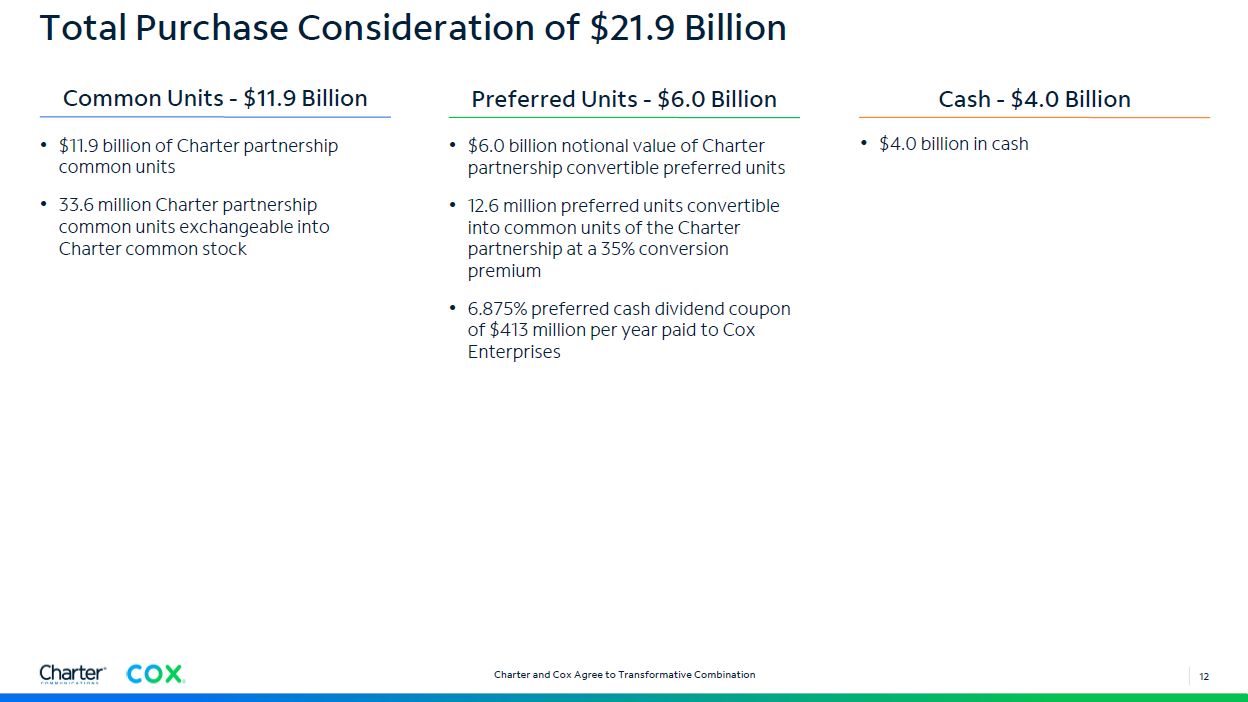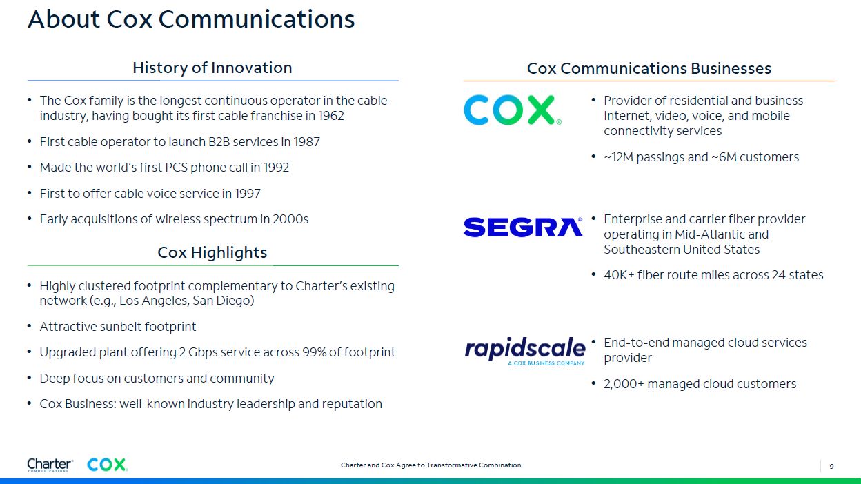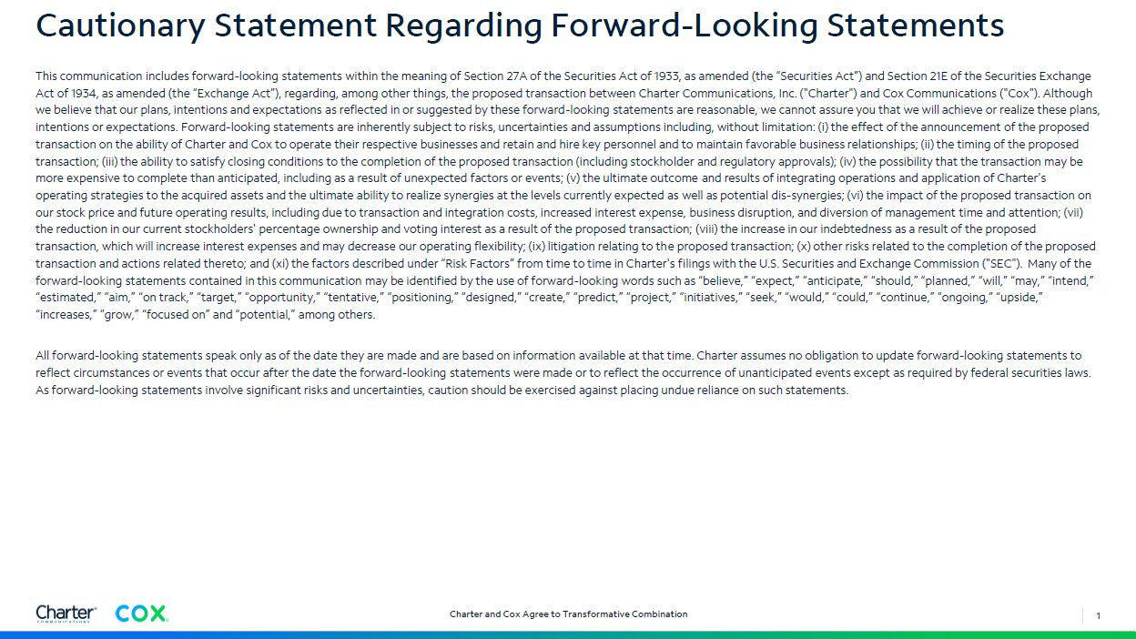Cautionary Statement Regarding Forward-Looking Statements  Charter and Cox Agree to Transformative Combination  1  This communication includes forward-looking statements within the meaning of Section 27A of the Securities Act of 1933, as amended (the “Securities Act”) and Section 21E of the Securities Exchange Act of 1934, as amended (the “Exchange Act”), regarding, among other things, the proposed transaction between Charter Communications, Inc. ("Charter") and Cox Communications ("Cox"). Although we believe that our plans, intentions and expectations as reflected in or suggested by these forward-looking statements are reasonable, we cannot assure you that we will achieve or realize these plans, intentions or expectations. Forward-looking statements are inherently subject to risks, uncertainties and assumptions including, without limitation: (i) the effect of the announcement of the proposed transaction on the ability of Charter and Cox to operate their respective businesses and retain and hire key personnel and to maintain favorable business relationships; (ii) the timing of the proposed transaction; (iii) the ability to satisfy closing conditions to the completion of the proposed transaction (including stockholder and regulatory approvals); (iv) the possibility that the transaction may be more expensive to complete than anticipated, including as a result of unexpected factors or events; (v) the ultimate outcome and results of integrating operations and application of Charter's operating strategies to the acquired assets and the ultimate ability to realize synergies at the levels currently expected as well as potential dis-synergies; (vi) the impact of the proposed transaction on our stock price and future operating results, including due to transaction and integration costs, increased interest expense, business disruption, and diversion of management time and attention; (vii) the reduction in our current stockholders' percentage ownership and voting interest as a result of the proposed transaction; (viii) the increase in our indebtedness as a result of the proposed transaction, which will increase interest expenses and may decrease our operating flexibility; (ix) litigation relating to the proposed transaction; (x) other risks related to the completion of the proposed transaction and actions related thereto; and (xi) the factors described under “Risk Factors” from time to time in Charter's filings with the U.S. Securities and Exchange Commission ("SEC"). Many of the forward-looking statements contained in this communication may be identified by the use of forward-looking words such as “believe,” “expect,” “anticipate,” “should,” “planned,” “will,” “may,” “intend,” “estimated,” “aim,” “on track,” “target,” “opportunity,” “tentative,” “positioning,” “designed,” “create,” “predict,” “project,” “initiatives,” “seek,” “would,” “could,” “continue,” “ongoing,” “upside,” “increases,” “grow,” “focused on” and “potential,” among others.  All forward-looking statements speak only as of the date they are made and are based on information available at that time. Charter assumes no obligation to update forward-looking statements to reflect circumstances or events that occur after the date the forward-looking statements were made or to reflect the occurrence of unanticipated events except as required by federal securities laws. As forward-looking statements involve significant risks and uncertainties, caution should be exercised against placing undue reliance on such statements.