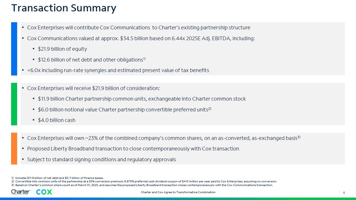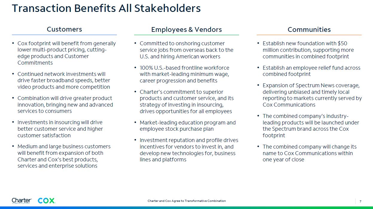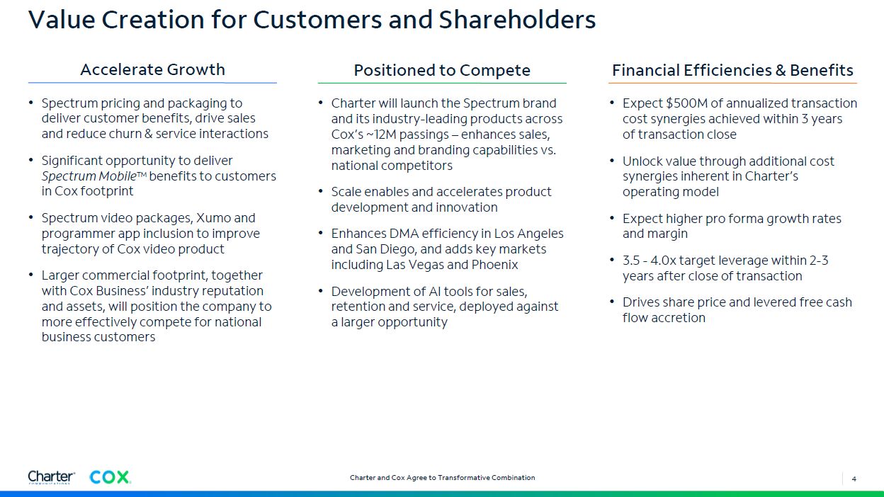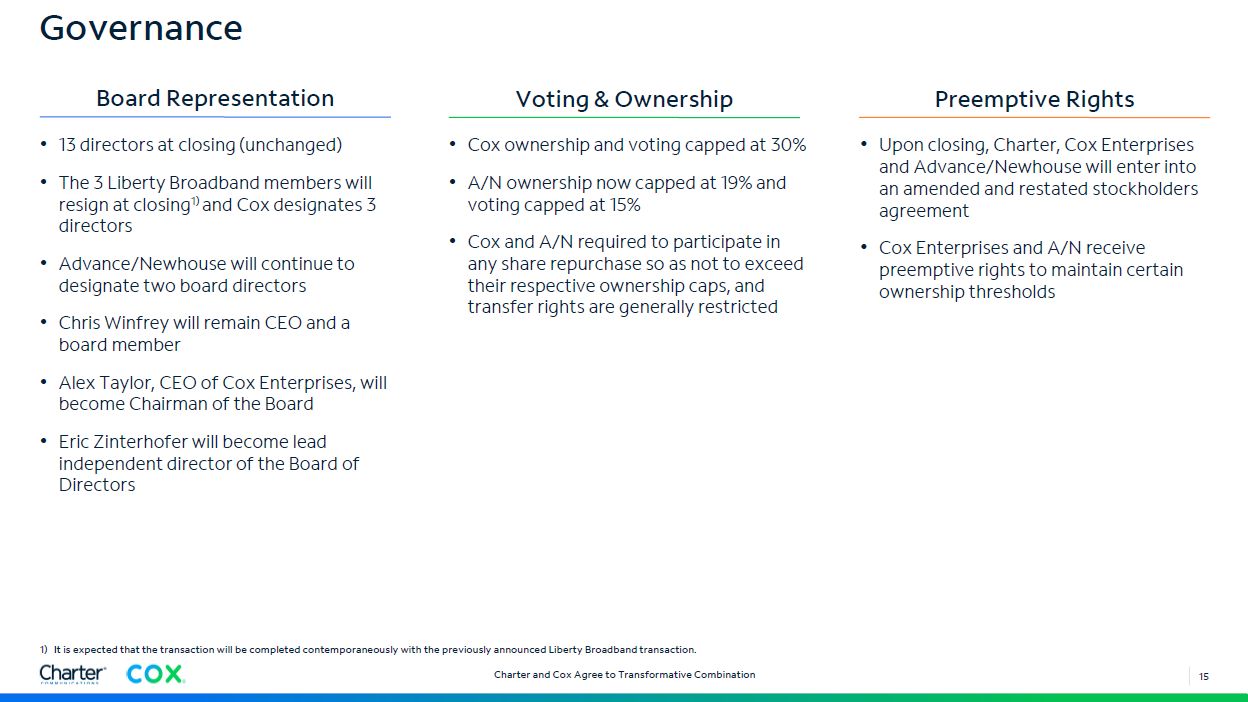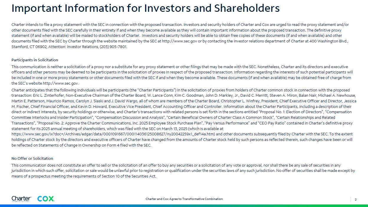 Important Information for Investors and Shareholders  Charter and Cox Agree to Transformative Combination  2  Charter intends to file a proxy statement with the SEC in connection with the proposed transaction. Investors and security holders of Charter and Cox are urged to read the proxy statement and/or other documents filed with the SEC carefully in their entirety if and when they become available as they will contain important information about the proposed transaction. The definitive proxy statement (if and when available) will be mailed to stockholders of Charter. Investors and security holders will be able to obtain free copies of these documents (if and when available) and other documents filed with the SEC by Charter through the website maintained by the SEC at http://www.sec.gov or by contacting the investor relations department of Charter at 400 Washington Blvd., Stamford, CT 06902, Attention: Investor Relations, (203) 905-7801.  Participants in Solicitation  This communication is neither a solicitation of a proxy nor a substitute for any proxy statement or other filings that may be made with the SEC. Nonetheless, Charter and its directors and executive officers and other persons may be deemed to be participants in the solicitation of proxies in respect of the proposed transaction. Information regarding the interests of such potential participants will be included in one or more proxy statements or other documents filed with the SEC if and when they become available. These documents (if and when available) may be obtained free of charge from the SEC's website http://www.sec.gov.  Charter anticipates that the following individuals will be participants (the “Charter Participants”) in the solicitation of proxies from holders of Charter common stock in connection with the proposed transaction: Eric L. Zinterhofer, Non-Executive Chairman of the Charter Board, W. Lance Conn, Kim C. Goodman, John D. Markley, Jr., David C. Merritt, Steven A. Miron, Balan Nair, Michael A. Newhouse, Martin E. Patterson, Mauricio Ramos, Carolyn J. Slaski and J. David Wargo, all of whom are members of the Charter Board, Christopher L. Winfrey, President, Chief Executive Officer and Director, Jessica  M. Fischer, Chief Financial Officer, and Kevin D. Howard, Executive Vice President, Chief Accounting Officer and Controller. Information about the Charter Participants, including a description of their direct or indirect interests, by security holdings or otherwise, and Charter's transactions with related persons is set forth in the sections entitled “Proposal No. 1: Election of Directors”, “Compensation Committee Interlocks and Insider Participation”, “Compensation Discussion and Analysis”, “Certain Beneficial Owners of Charter Class A Common Stock”, “Certain Relationships and Related Transactions”, “Proposal No. 2: Approve the Charter Communications, Inc. 2025 Employee Stock Purchase Plan”, “Pay Versus Performance” and “CEO Pay Ratio” contained in Charter's definitive proxy statement for its 2025 annual meeting of shareholders, which was filed with the SEC on March 13, 2025 (which is available at https://www.sec.gov/ix?doc=/Archives/edgar/data/0001091667/000114036125008627/ny20042259x1_def14a.htm) and other documents subsequently filed by Charter with the SEC. To the extent holdings of Charter stock by the directors and executive officers of Charter have changed from the amounts of Charter stock held by such persons as reflected therein, such changes have been or will be reflected on Statements of Change in Ownership on Form 4 filed with the SEC.  No Offer or Solicitation  This communication does not constitute an offer to sell or the solicitation of an offer to buy any securities or a solicitation of any vote or approval, nor shall there be any sale of securities in any jurisdiction in which such offer, solicitation or sale would be unlawful prior to registration or qualification under the securities laws of any such jurisdiction. No offer of securities shall be made except by means of a prospectus meeting the requirements of Section 10 of the Securities Act.