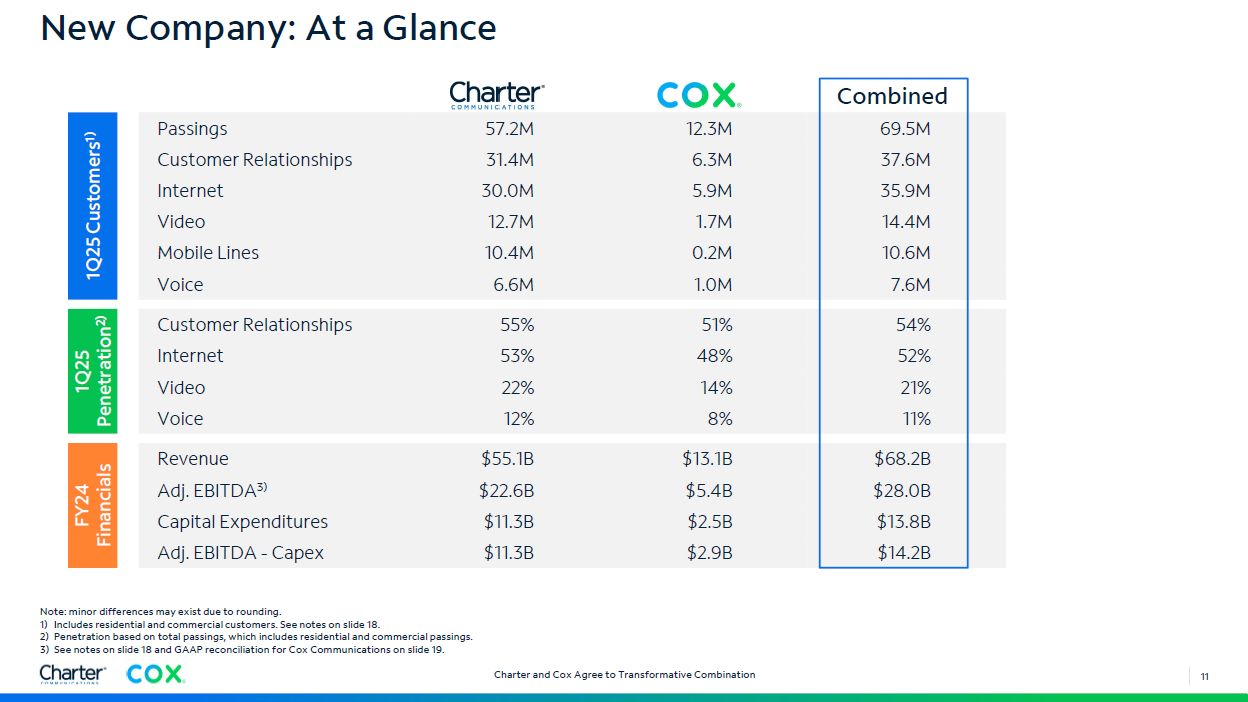 New Company: At a Glance  Combined  1Q25 Customers1)  Passings  Customer Relationships  Internet Video Mobile Lines Voice  57.2M  31.4M  30.0M  12.7M  10.4M  6.6M  12.3M  6.3M  5.9M  1.7M  0.2M  1.0M  69.5M  37.6M  35.9M  14.4M  10.6M  7.6M  1Q25  Penetration2)  Customer Relationships Internet  Video Voice  55%  53%  22%  12%  51%  48%  14%  8%  54%  52%  21%  11%  FY24  Financials  Revenue  Adj. EBITDA3)  Capital Expenditures Adj. EBITDA - Capex  $55.1B  $22.6B  $11.3B  $11.3B  $13.1B  $5.4B  $2.5B  $2.9B  $68.2B  $28.0B  $13.8B  $14.2B  Note: minor differences may exist due to rounding.  Includes residential and commercial customers. See notes on slide 18.  Penetration based on total passings, which includes residential and commercial passings.  See notes on slide 18 and GAAP reconciliation for Cox Communications on slide 19.  Charter and Cox Agree to Transformative Combination  11