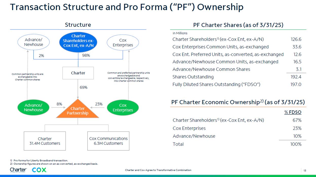 Charter Shareholders ex- Cox Ent, ex-A/N  Transaction Structure and Pro Forma (“PF”) Ownership  Pro forma for Liberty Broadband transaction.  Ownership figures are shown on an as-converted, as-exchanged basis.  Structure PF Charter Shares (as of 3/31/25)  in Millions  PF Charter Economic Ownership2) (as of 3/31/25)  % FDSO  Charter Shareholders1) (ex-Cox Ent, ex-A/N)  67%  Cox Enterprises  23%  Advance/Newhouse  10%  Total  100%  Charter  Charter Partnership  Charter  31.4M Customers  Cox Communications  6.3M Customers  69%  23%  Advance/  Newhouse  8%  Cox Enterprises  Cox Enterprises  Advance/ Newhouse  2%  98%  Charter Shareholders1) (ex-Cox Ent, ex-A/N)  126.6  Cox Enterprises Common Units, as-exchanged  33.6  Cox Ent. Preferred Units, as-converted, as-exchanged  12.6  Advance/Newhouse Common Units, as-exchanged  16.5  Advance/Newhouse Common Shares  3.1  Shares Outstanding  192.4  Fully Diluted Shares Outstanding (“FDSO”)  197.0  Common and preferred partnership units are exchangeable and convertible/exchangeable, respectively,  Charter and Cox Agree to Transforma