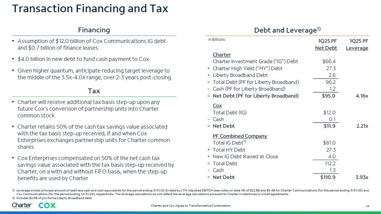 Transaction Financing and Tax  Charter will receive additional tax basis step-up upon any future Cox’s conversion of partnership units into Charter common stock  Charter retains 50% of the cash tax savings value associated with the tax basis step-up received, if and when Cox Enterprises exchanges partnership units for Charter common shares  Cox Enterprises compensated on 50% of the net cash tax savings value associated with the tax basis step-up received by Charter, on a with and without FIFO basis, when the step-up benefits are used by Charter  1) Leverage is total principal amount of debt less cash and cash equivalents for the period ending 3/31/25 divided by LTM Adjusted EBITDA (see notes on slide 18) of $22.8B and $5.4B for Charter Communications (for the period ending 3/31/25) and  Cox Communications (for the period ending 12/31/24), respectively. The leverage calculations do not reflect the leverage calculations pursuant to Charter’s indentures or credit agreements.  Assumption of $12.0 billion of Cox Communications IG debt  and $0.7 billion of finance leases  $4.0 billion in new debt to fund cash payment to Cox  Given higher quantum, anticipate reducing target leverage to the middle of the 3.5x-4.0x range, over 2-3 years post-closing  Debt and Leverage1)  Financing  in Billions  Tax  1Q25 PF  Net Debt  2) Includes $2.6B of pro forma Liberty Broadband debt.  Charter and Cox Agree to Transformative Combination  14  1Q25 PF  Leverage  Charter  Charter Investment Grade ("IG") Debt  + Charter High Yield ("HY") Debt  + Liberty Broadband Debt  = Total Debt (PF for Liberty Broadband)  - Cash (PF for Liberty Broadband)  $66.4 27.3   2.6   96.2   1.2   =  Net Debt (PF for Liberty Broadband)  $95.0  4.16x  Cox  Total Debt (IG)  $12.0  -  Cash   0.1   =  Net Debt  $11.9  2.21x  PF Combined Company  Total IG Debt2)  $81.0  +  Total HY Debt  27.3  +  New IG Debt Raised at Close   4.0   =  Total Debt  112.2  -  Cash   1.3   =  Net Debt  $110.9  3.93x