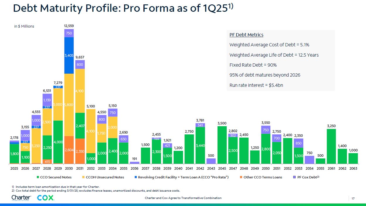 415  2,604 2,350  -  1,800  1,100  2,250  4,000  2,407  1,000  2,000  2,400  2,000  2,300  1,500  3,440  2,500  2,800  2,050  1,500  750  3,250  3,000 5,800  4,100  4,100  1,750  2,000  227  227  227  227  1,000 2,500  1,139  750  800  800  750  650  155  421  341  302  750  700  850  2,178 1,000  3,155  4,555  6,531  7,279  3,405 9,657  12,559  5,100  4,550  5,150  2,650  191  1,500  2,455  1,921  1,200  2,750  3,781  500  3,500  2,802  2,450  1,250  3,550  2,750  2,400 2,350  750  500  3,250  1,400  1,000  Debt Maturity Profile: Pro Forma as of 1Q251)  PF Debt Metrics  Weighted Average Cost of Debt = 5.1% Weighted Average Life of Debt = 12.5 Years Fixed Rate Debt = 90%  95% of debt matures beyond 2026  Run rate interest = $5.4bn  -  2025 2026 2027 2028 2029 2030 2031 2032 2033 2034 2035 2036 2037 2038 2039 2040 2041 2042 2043 2045 2047 2048 2049 2050 2051 2052 2053 2054 2055 2061 2062 2063  CCO Secured Notes CCOH Unsecured Notes Revolving Credit Facility + Term Loan A (CCO “Pro Rata”) Other CCO Terms Loans PF Cox Debt2)  Includes term loan amortization due in that year for Charter.  Cox total debt for the period ending 3/31/25; excludes finance leases, unamortized discounts, and debt issuance costs.  Charter and Cox Agree to Transformative Combination  17  in $ Millions