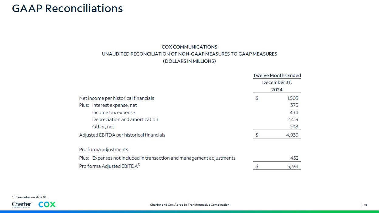 COX COMMUNICATIONS  UNAUDITED RECONCILIATION OF NON-GAAP MEASURES TO GAAP MEASURES (DOLLARS IN MILLIONS)  Twelve Months Ended December 31,  2024  Net income per historical financials  $  1,505  Plus: Interest expense, net  373  Income tax expense  434  Depreciation and amortization  2,419  Other, net  208  Adjusted EBITDA per historical financials  $  4,939  Pro forma adjustments:  Plus: Expenses not included in transaction and management adjustments  452  Pro forma Adjusted EBITDA1)  $  5,391  GAAP Reconciliations  Charter and Cox Agree to Transformative Combination  19  1) See notes on slide 18.