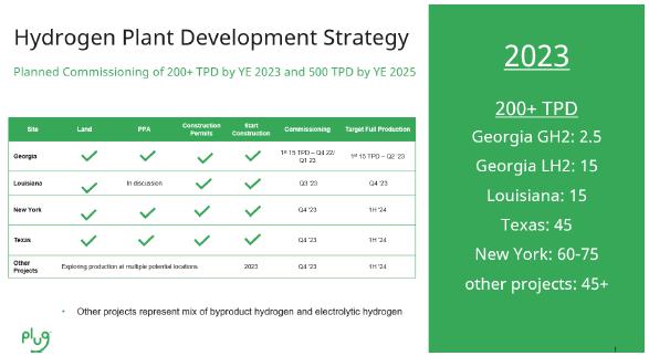 Olin JV - Louisiana: Plug and Olin announced the launch of a 50/50 JV to begin construction of a 15TPD hydrogen plant in Louisiana. This site broke ground in Q1 2023 and continues to make solid progress with Plug and Olin collaborating on engineering and procurement at the facility. Key construction and commissioning activities are planned to take place during the remainder of 2023.