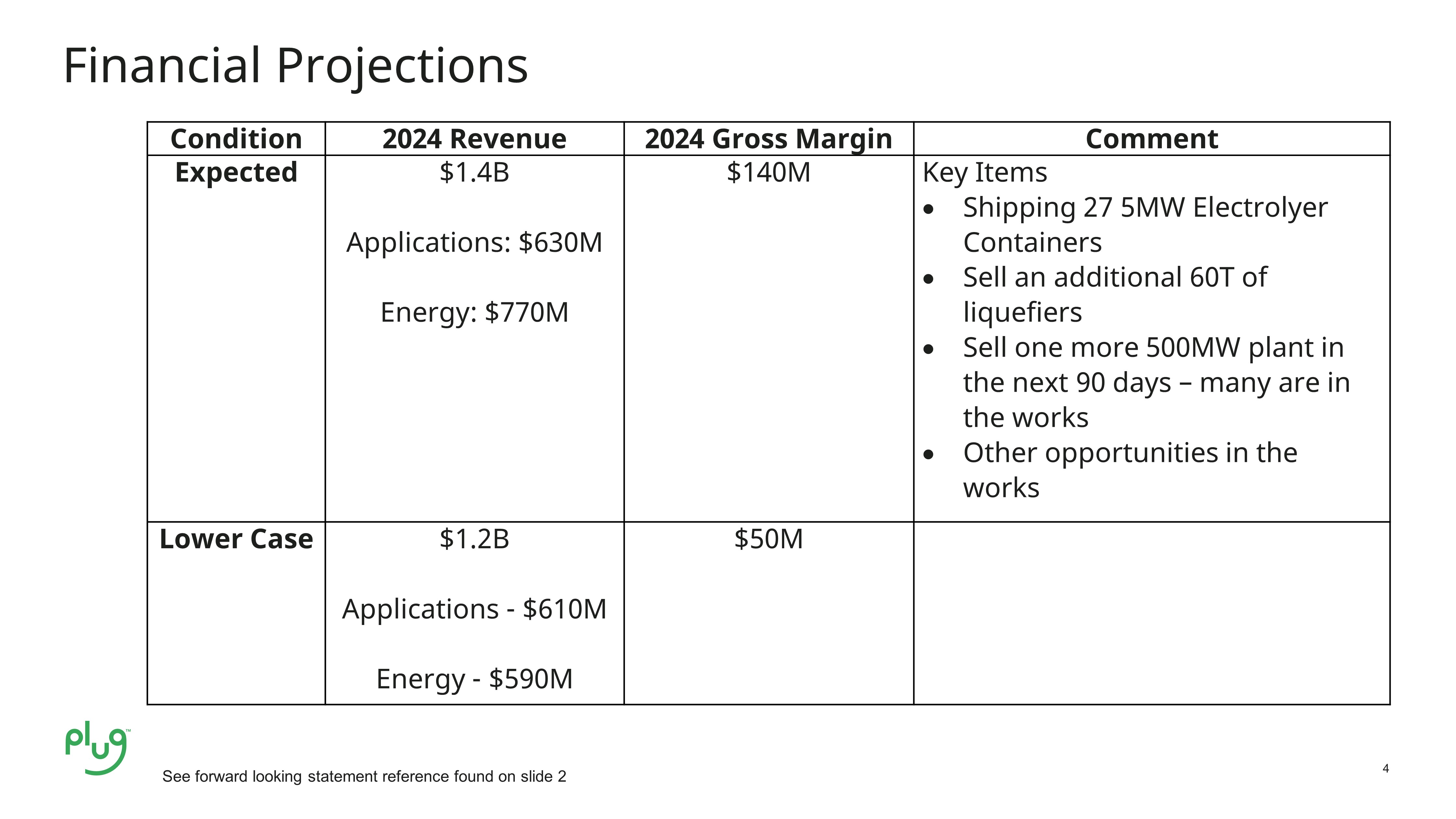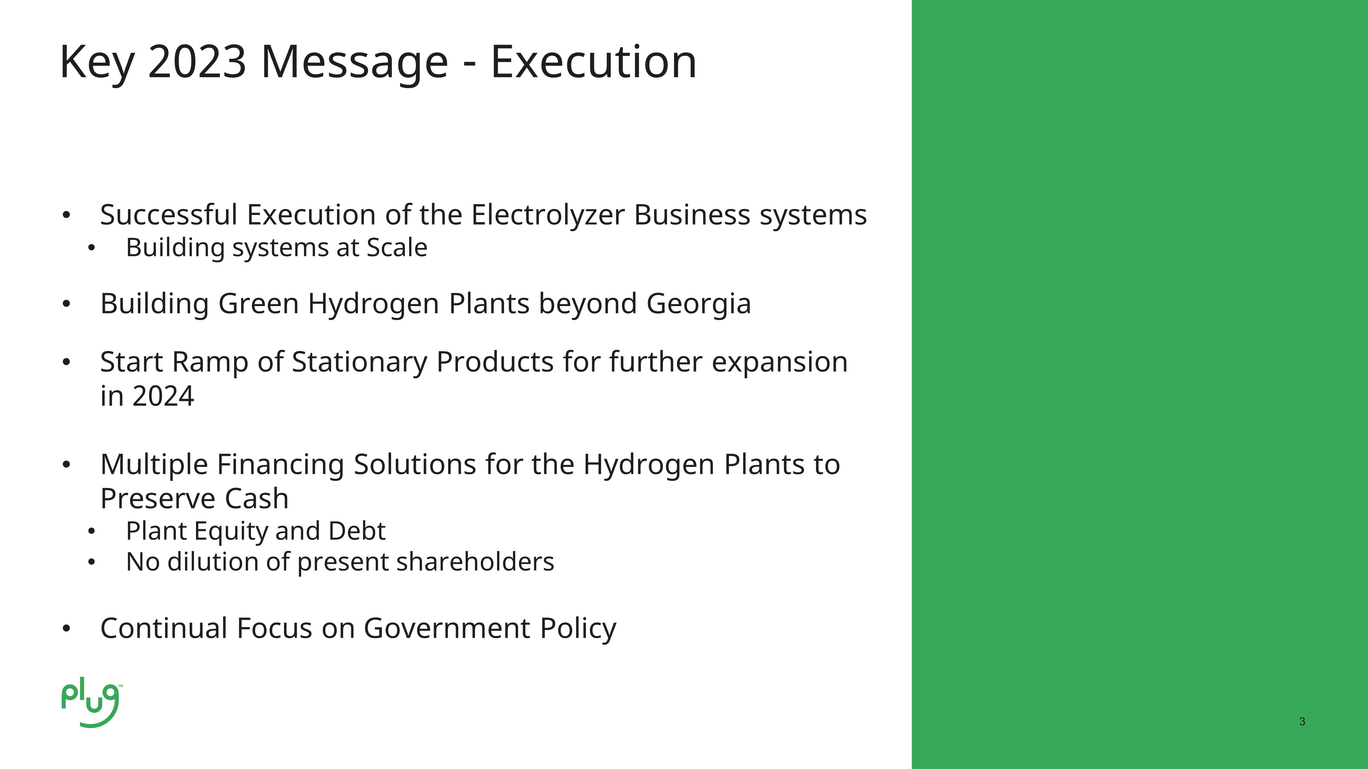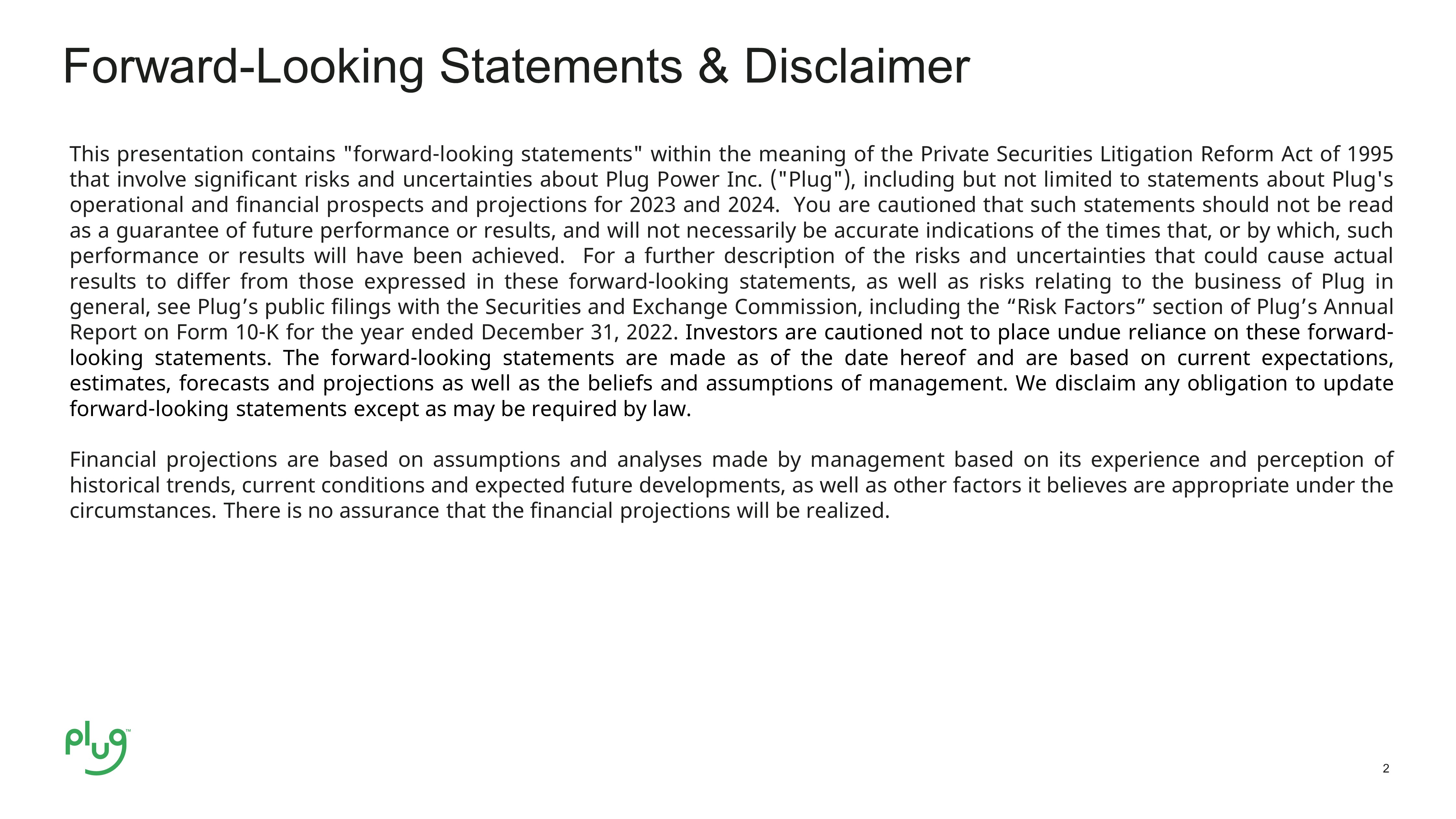 2 This presentation contains "forward - looking statements" within the meaning of the Private Securities Litigation Reform Act of 1995 that involve significant risks and uncertainties about Plug Power Inc . ("Plug"), including but not limited to statements about Plug's operational and financial prospects and projections for 2023 and 2024 . You are cautioned that such statements should not be read as a guarantee of future performance or results, and will not necessarily be accurate indications of the times that, or by which, such performance or results will have been achieved . For a further description of the risks and uncertainties that could cause actual results to differ from those expressed in these forward - looking statements, as well as risks relating to the business of Plug in general, see Plug’s public filings with the Securities and Exchange Commission, including the “Risk Factors” section of Plug’s Annual Report on Form 10 - K for the year ended December 31 , 2022 . Investors are cautioned not to place undue reliance on these forward - looking statements . The forward - looking statements are made as of the date hereof and are based on current expectations, estimates, forecasts and projections as well as the beliefs and assumptions of management . We disclaim any obligation to update forward - looking statements except as may be required by law . Financial projections are based on assumptions and analyses made by management based on its experience and perception of historical trends, current conditions and expected future developments, as well as other factors it believes are appropriate under the circumstances . There is no assurance that the financial projections will be realized . Forward - Looking Statements & Disclaimer