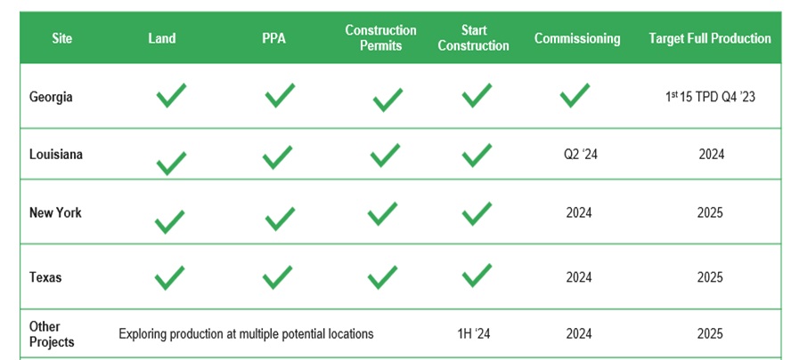Timeline management for first-of-kind projects: Timelines at Georgia, and key changes listed above, allow our project execution timelines to have lower risk and greater oversight, ensuring completion of future plants on targeted timelines.