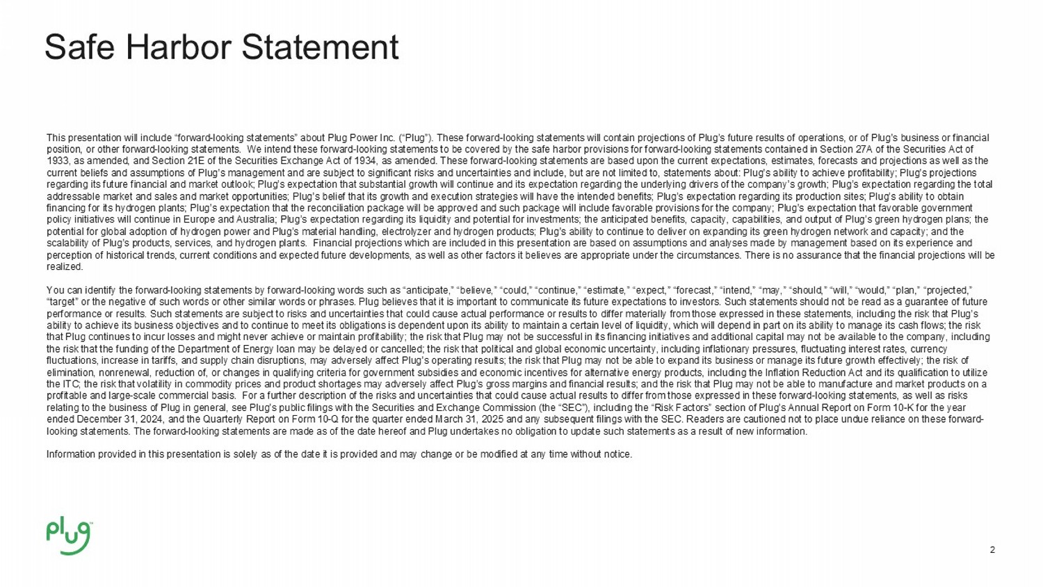 2 This presentation will include “forward - looking statements” about Plug Power Inc. (“Plug”). These forward - looking statements wil l contain projections of Plug’s future results of operations, or of Plug’s business or financial position, or other forward - looking statements. We intend these forward - looking statements to be covered by the safe harbor prov isions for forward - looking statements contained in Section 27A of the Securities Act of 1933, as amended, and Section 21E of the Securities Exchange Act of 1934, as amended. These forward - looking statements are based upon the current expectations, estimates, forecasts and projections as well as the current beliefs and assumptions of Plug’s management and are subject to significant risks and uncertainties and include, but are not limited to, statements about: Plug’s ability to achieve profitability; Plug’s projections regarding its future financial and market outlook; Plug’s expectation that substantial growth will continue and its expectati on regarding the underlying drivers of the company’s growth; Plug’s expectation regarding the total addressable market and sales and market opportunities; Plug’s belief that its growth and execution strategies will have the i nte nded benefits; Plug’s expectation regarding its production sites; Plug’s ability to obtain financing for its hydrogen plants; Plug’s expectation that the reconciliation package will be approved and such package will inc lude favorable provisions for the company; Plug’s expectation that favorable government policy initiatives will continue in Europe and Australia; Plug’s expectation regarding its liquidity and potential for invest men ts; the anticipated benefits, capacity, capabilities, and output of Plug’s green hydrogen plans; the potential for global adoption of hydrogen power and Plug’s material handling, electrolyzer and hydrogen products; Plug’s abil ity to continue to deliver on expanding its green hydrogen network and capacity; and the scalability of Plug’s products, services, and hydrogen plants. Financial projections which are included in this presentation ar e based on assumptions and analyses made by management based on its experience and perception of historical trends, current conditions and expected future developments, as well as other factors it believes ar e a ppropriate under the circumstances. There is no assurance that the financial projections will be realized. You can identify the forward - looking statements by forward - looking words such as “anticipate,” “believe,” “could,” “continue,” “ estimate,” “expect,” “forecast,” “intend,” “may,” “should,” “will,” “would,” “plan,” “projected,” “target” or the negative of such words or other similar words or phrases. Plug believes that it is important to communicate i ts future expectations to investors. Such statements should not be read as a guarantee of future performance or results. Such statements are subject to risks and uncertainties that could cause actual performance or results to differ materially from those expressed in these statements, including the risk that Plug’s ability to achieve its business objectives and to continue to meet its obligations is dependent upon its ability to maintain a c ertain level of liquidity, which will depend in part on its ability to manage its cash flows; the risk that Plug continues to incur losses and might never achieve or maintain profitability; the risk that Plug may not be successf ul in its financing initiatives and additional capital may not be available to the company, including the risk that the funding of the Department of Energy loan may be delayed or cancelled; the risk that political and global ec ono mic uncertainty, including inflationary pressures, fluctuating interest rates, currency fluctuations, increase in tariffs, and supply chain disruptions, may adversely affect Plug’s operating results; the risk that Pl ug may not be able to expand its business or manage its future growth effectively; the risk of elimination, nonrenewal, reduction of, or changes in qualifying criteria for government subsidies and economic incentives for al ternative energy products, including the Inflation Reduction Act and its qualification to utilize the ITC; the risk that volatility in commodity prices and product shortages may adversely affect Plug’s gross margins and fin anc ial results; and the risk that Plug may not be able to manufacture and market products on a profitable and large - scale commercial basis. For a further description of the risks and uncertainties that could cause actual r esults to differ from those expressed in these forward - looking statements, as well as risks relating to the business of Plug in general, see Plug’s public filings with the Securities and Exchange Commission (the “SEC” ), including the “Risk Factors” section of Plug’s Annual Report on Form 10 - K for the year ended December 31, 2024, and the Quarterly Report on Form 10 - Q for the quarter ended March 31, 2025 and any subsequent filings w ith the SEC. Readers are cautioned not to place undue reliance on these forward - looking statements. The forward - looking statements are made as of the date hereof and Plug undertakes no obligation to update su ch statements as a result of new information. Information provided in this presentation is solely as of the date it is provided and may change or be modified at any time w ith out notice. Safe Harbor Statement